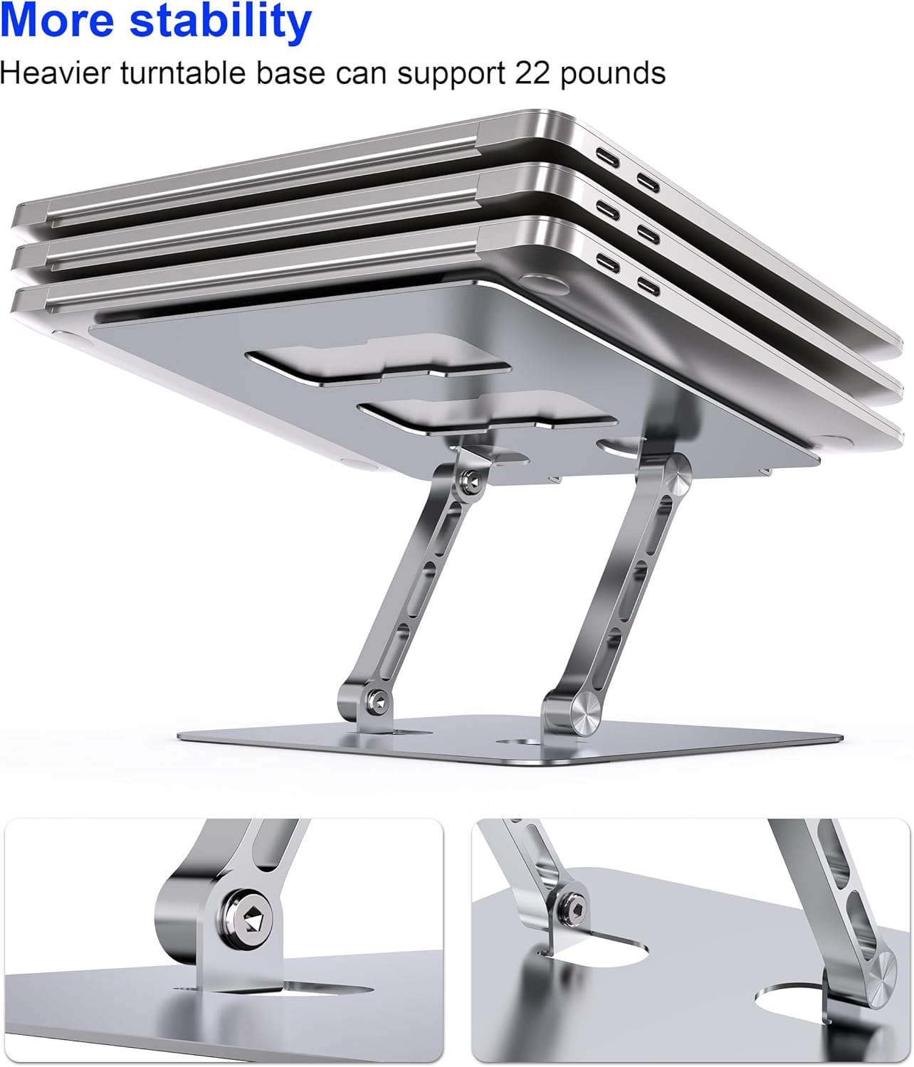 - More stability: The office computer stand is made of high-quality thickened aluminum, and the larger and heavier turntable base can support 22 pounds (10 kg), which is more stable and stronger without worrying about any shaking.Rubber non-slip strips on the stand add friction to protect your laptop from scratches and slippage