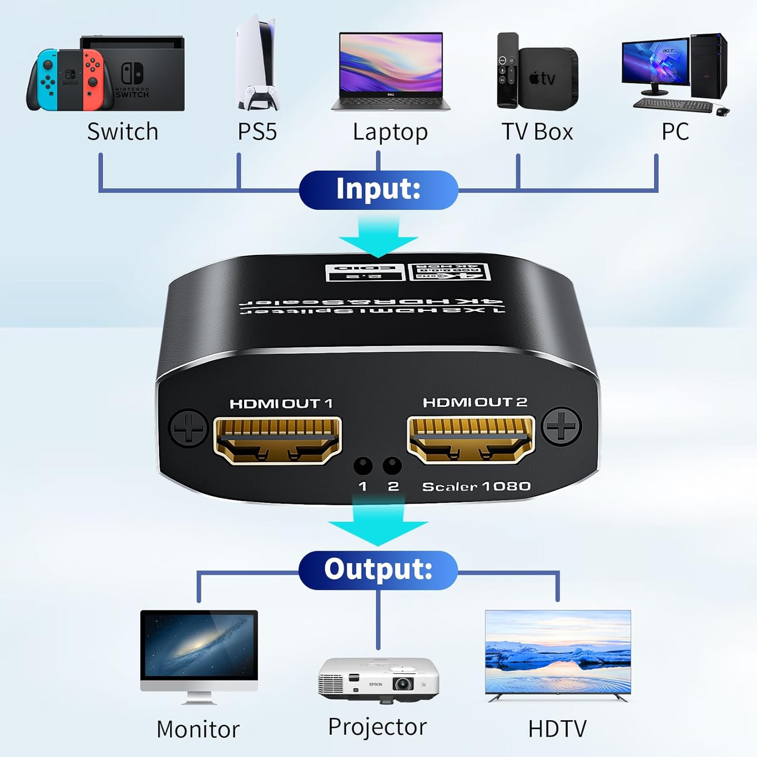 1x2 HDMI Splitter, HDR 4K@60Hz HDMI spliter 1 in 2 Out, Supports HDMI 2.0, HDCP 2.2, Mirror Screen Monitors Supports EDID Control for Xbox PS3/4/5 PC DVD Fire Stick Blu-Ray Player TV