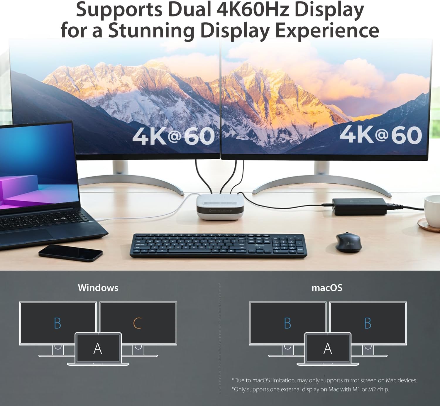 - 【Dual 4K60 Display】: Unleash the power of MST dual 4K60 display support, providing an unparalleled visual experience. Enhance productivity by enabling efficient multitasking and streamlined work in professional applications. *Note 1: Due to macOS limitation, may only supports mirror screen on Mac devices. *Note 2: Mac with M1, M2, or M3 chip only supports one external display.