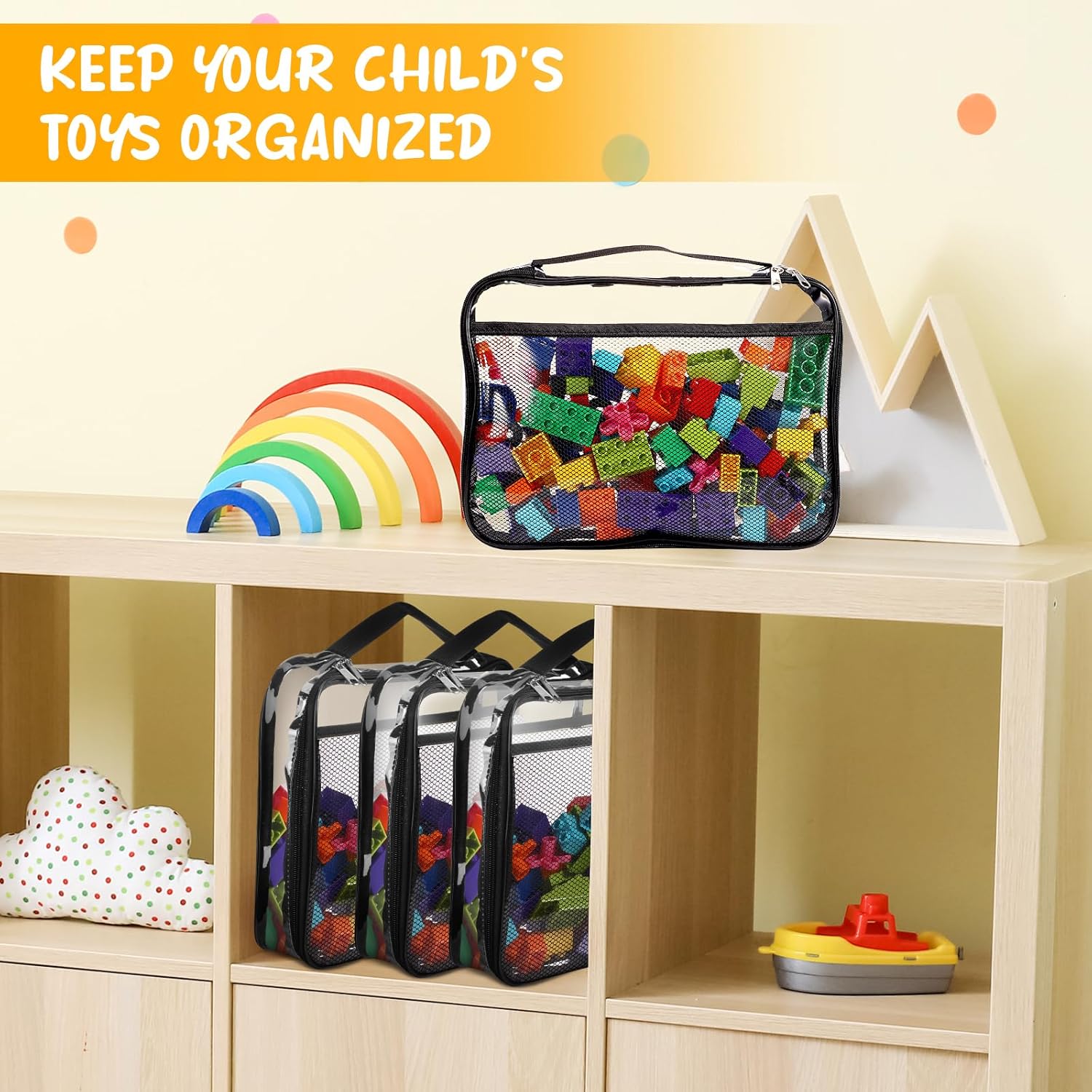 - 【Considerate Design】The toddler zipper storage bags for toys has a handle for children to carry toys and books outside. Its overall transparent design allow you to identify the items stored inside. In addition, the board game bags come with mesh pockets on the side. Not only can category labels be placed inside, but children's favorite storybooks and picture books can also be stored.