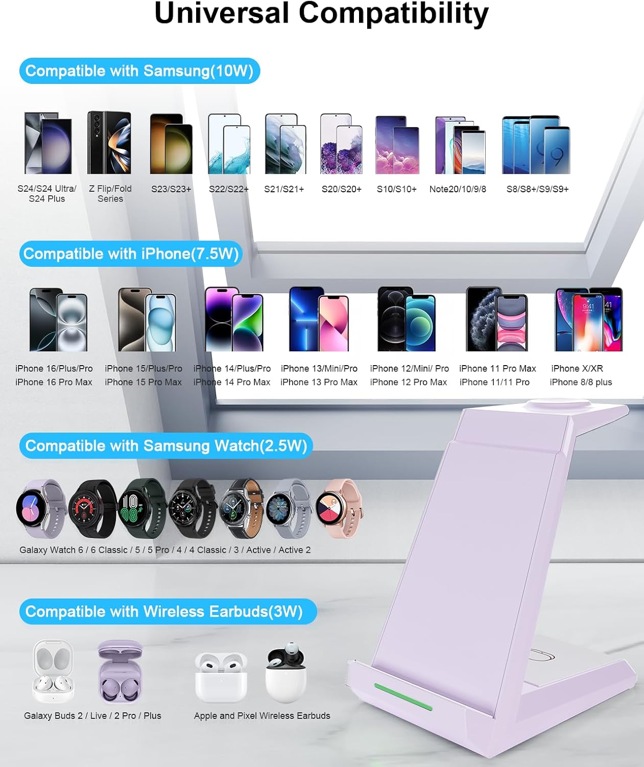 - [Compatible with Multiple Devices] The wireless phone charger dock has universal compatibility for more Qi devices. Phones: For Samsung Galaxy Z Flip/Fold/S24 Ultra/S23 Ultra/S22+/S21/S20 fe/Note 20/10; for iPhone 16/15/14 Pro Max/13 Pro/12/11/XR/XS/X/8 Plus. Wireless Earbuds: For Galaxy Buds/Buds Pro/Live ; AirPods 3/Pro/2 with wireless charging case. Watches: Only for Galaxy Watch 5/5 Pro/4/3 (Attention: Not for Apple Watch).
