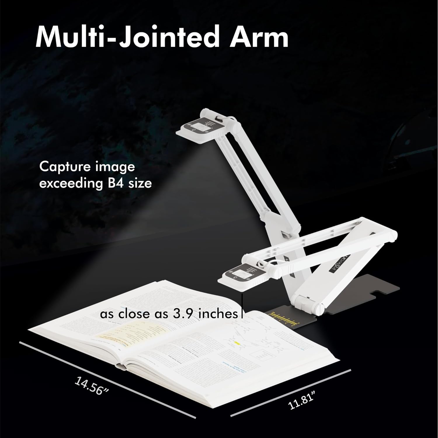 - [Adjustable Arm & Magnet-Friendly Metal Base] Supports documents larger than B4 (14.56” x 11.81”) and captures macro shots from just 3.9 inches. The sturdy metal base works with strong third-party magnets (not included), allowing secure mounting on metallic partitions or walls—helping you position the camera higher for a dramatically expanded view while saving desk space. The multi-joint arm allows flexible angle adjustments.