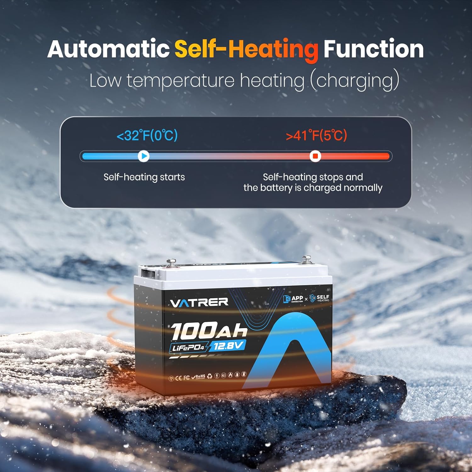 - 【Grade-A Cells & Upgraded 100A BMS】VATRER POWER 100Ah self-heating LiFePO4 batteries with Automotive Grade A LiFePO4 cells have uncompromising quality and higher energy density with better stability, which makes it possible to ensure long-term recycling. And highest-level safety is based on UL Testing Reports for the cells inside the battery and upgraded BMS with heating pads to protect it from overcharging, over-discharging, over-current, and short circuits with excellent self-discharge rate.