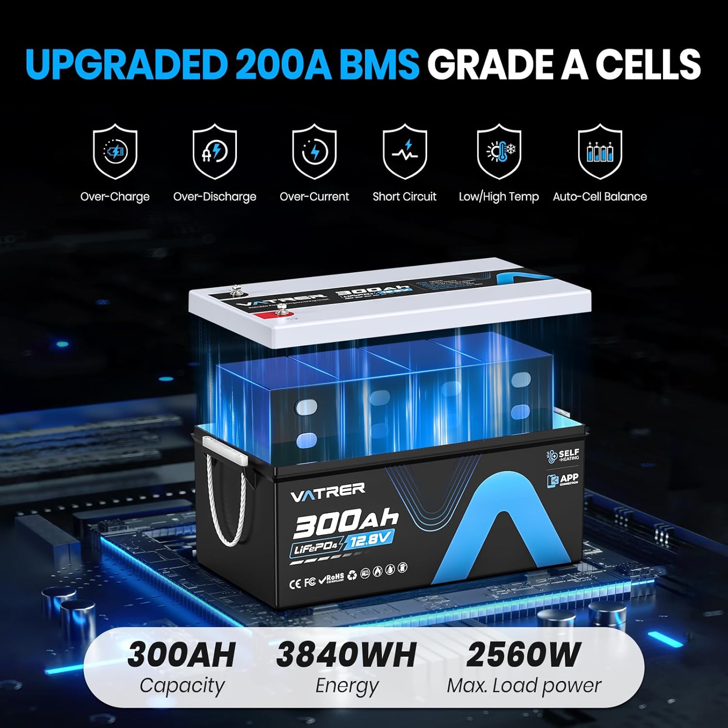 - 【Grade-A Cells & Upgraded 200A BMS】VATRER POWER 300Ah self-heating LiFePO4 batteries with Automotive Grade LiFePO4 cells have uncompromising quality and higher energy density with better stability, which makes it possible to ensure long-term recycling. And highest-level safety is based on UL Testing Reports for the cells inside the battery and upgraded BMS with heating pads to protect it from overcharging, over-discharging, over-current, and short circuits with excellent self-discharge rate.