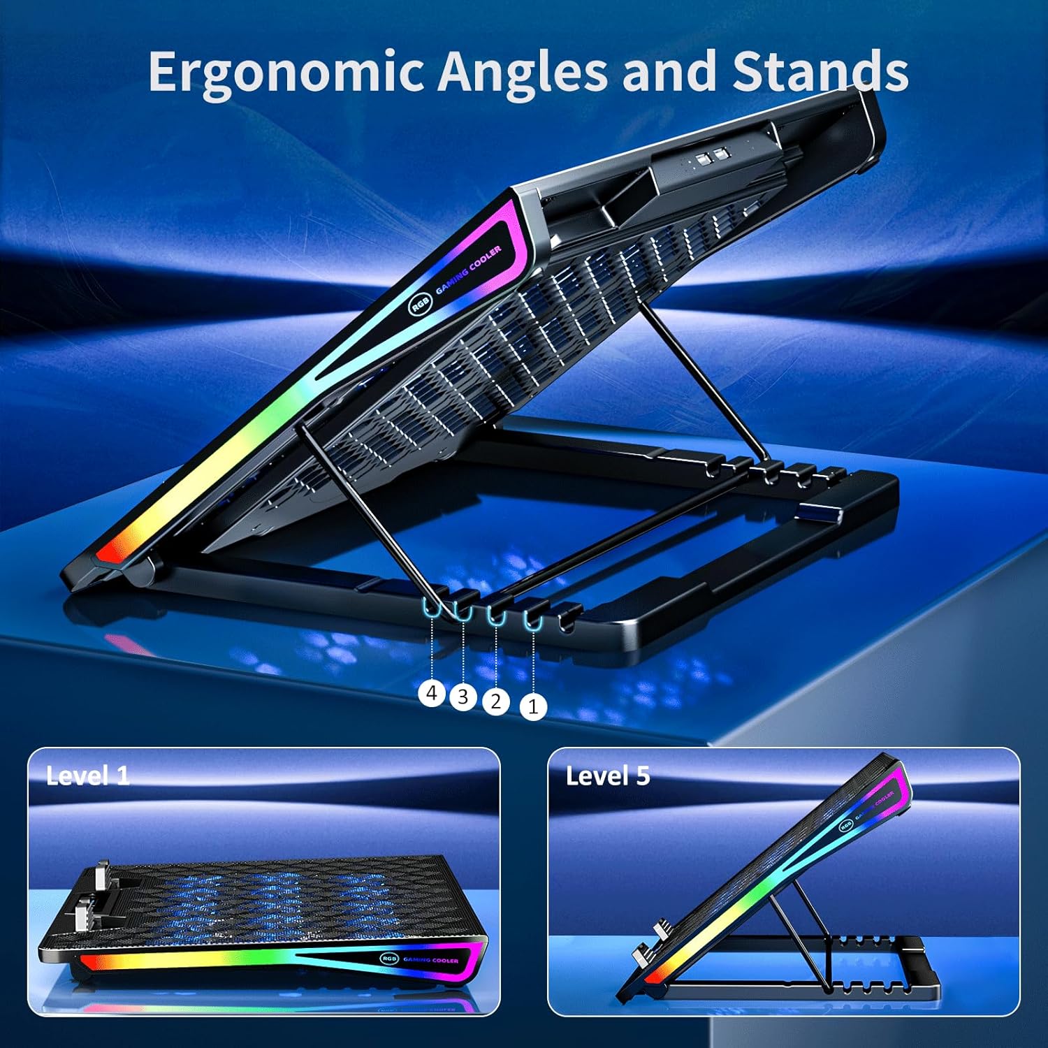 - Adjustable Ergonomic Design: Choose from 4 adjustable stands and angles for comfortable gaming posture, the laptop fan cooling pad raises the screen height level of your PC from 4.3" to 7.5", reducing your shoulder, neck, and eye fatigue