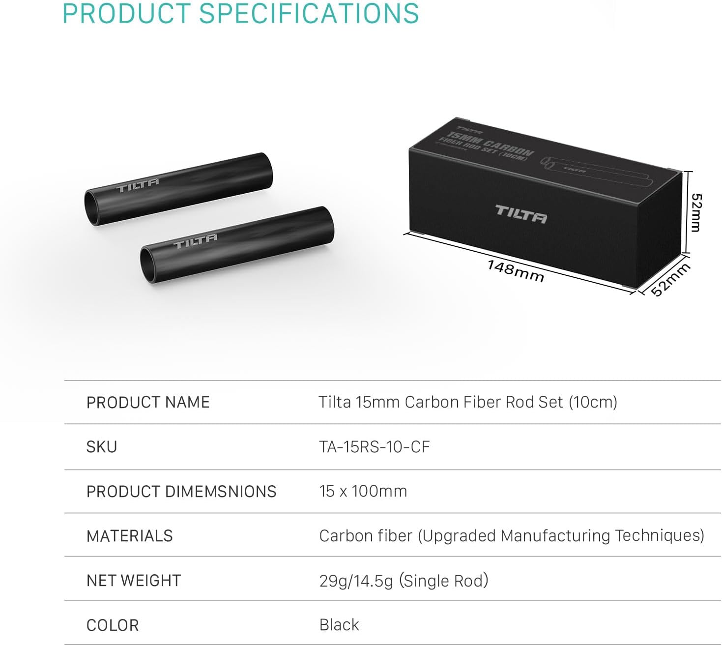 Tilta 2X Carbon Fiber Rods 15mm for Rail Support System | Increased Strength | Limited Reflection | Lightweight | DSLR Shoulder Rig, Camera Stabilizer Cage, Matte Box (10cm)