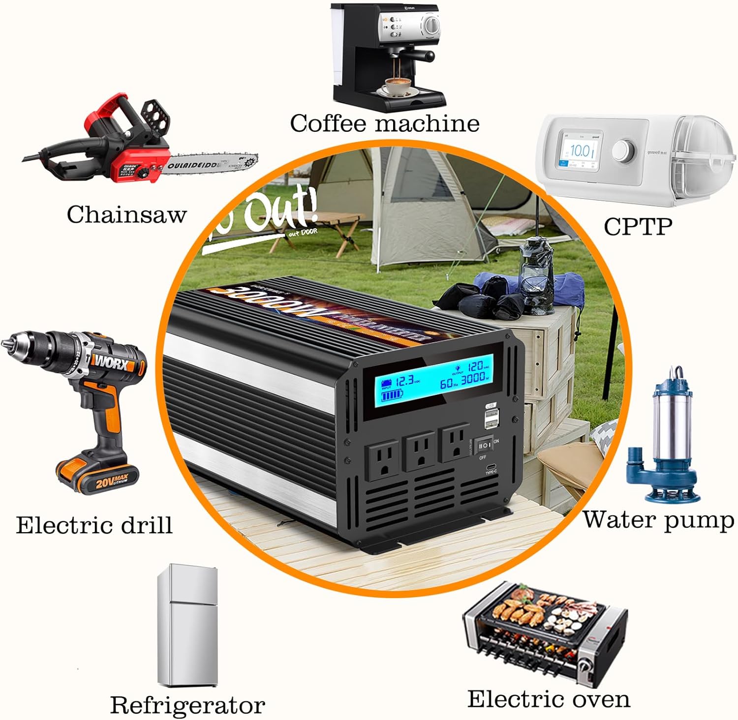 - [WIDE APPLICATION] 3 AC outlets and 3.4A USB ports provide 3000 watts of continuous power supply, perfect for gifts, cell phones, laptops, lights, digital cameras, breast pumps, televisions, power tools, microwave ovens, and other electronic products.