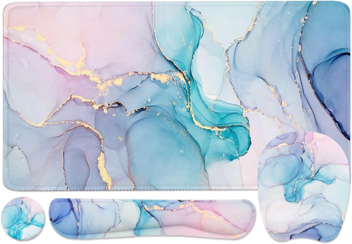 Keyboard Wrist Rest Large Mouse Pad Wrist Support for Computer, 4 in 1 Memory Foam Keyboard Pad Desk Mat Ergonomic Hand Rest Wrist Cushion for Home Office Gaming - Blue Marble