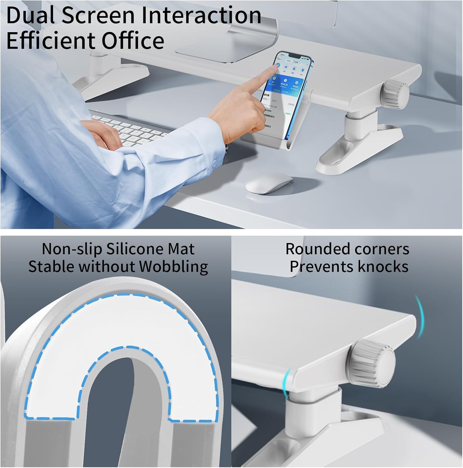 - 【Comes with a hidden mobile phone holder for better work】 We thoughtfully designed a hidden mobile phone holder on the computer screen stand, so that you can use your computer and mobile phone for work and entertainment at the same time, saving you the trouble of rummaging for your mobile phone. You can easily retract the phone holder when not using it, keeping the computer stand for desktop monitor tidy.
