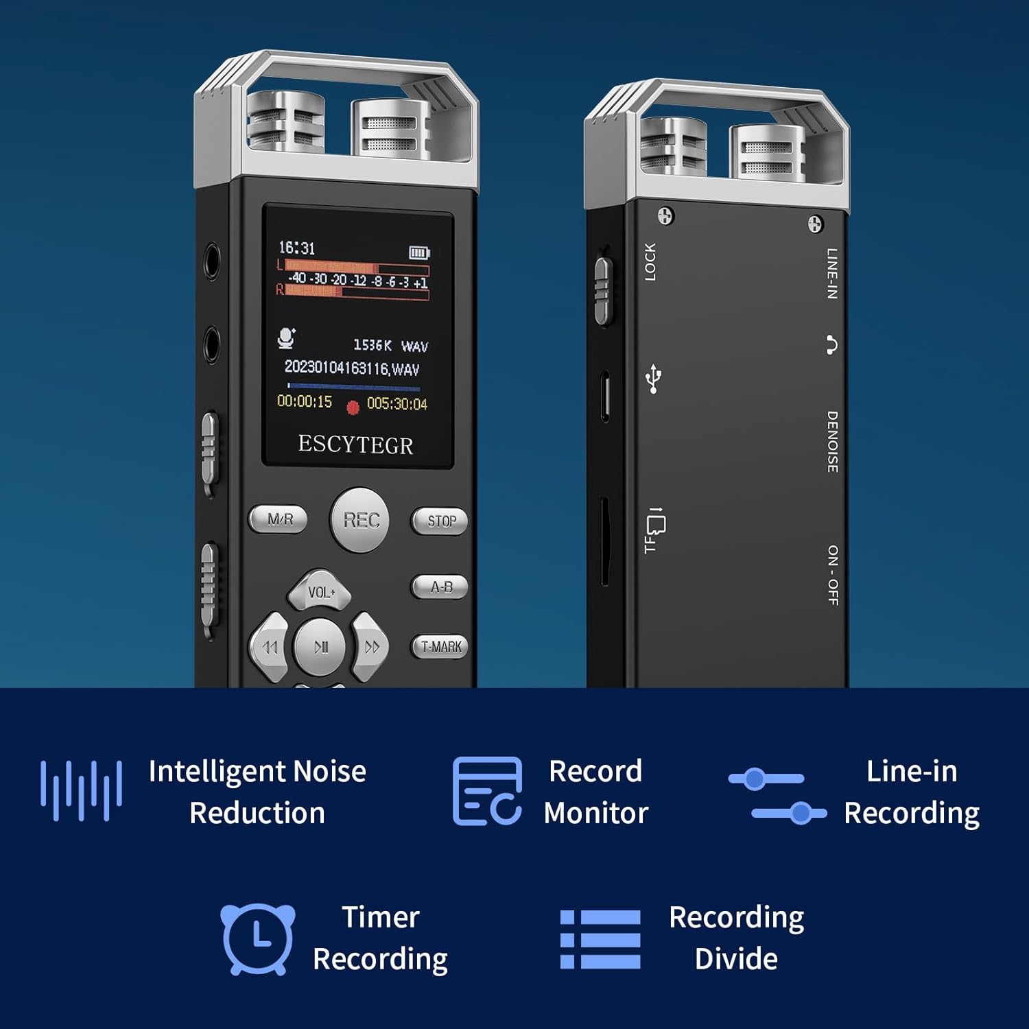 - ● ✅【Versatile & Unbeatable Value】➡️ The ESCYTEGR voice recorder is a multi-functional powerhouse, featuring voice operated recording ★Recording monitor ★Timer recording ★Line-in ★T-MAKR ★Automatic noise reduction ★Automatic gain control ★Recording divide ★Recording timestamp ★A-B repeat /Cyclic playback ★Standard 3.5mm earphone ★Built-in speaker ★As MP3 player ★Variable speed playback ★Password protection ★File transfer
