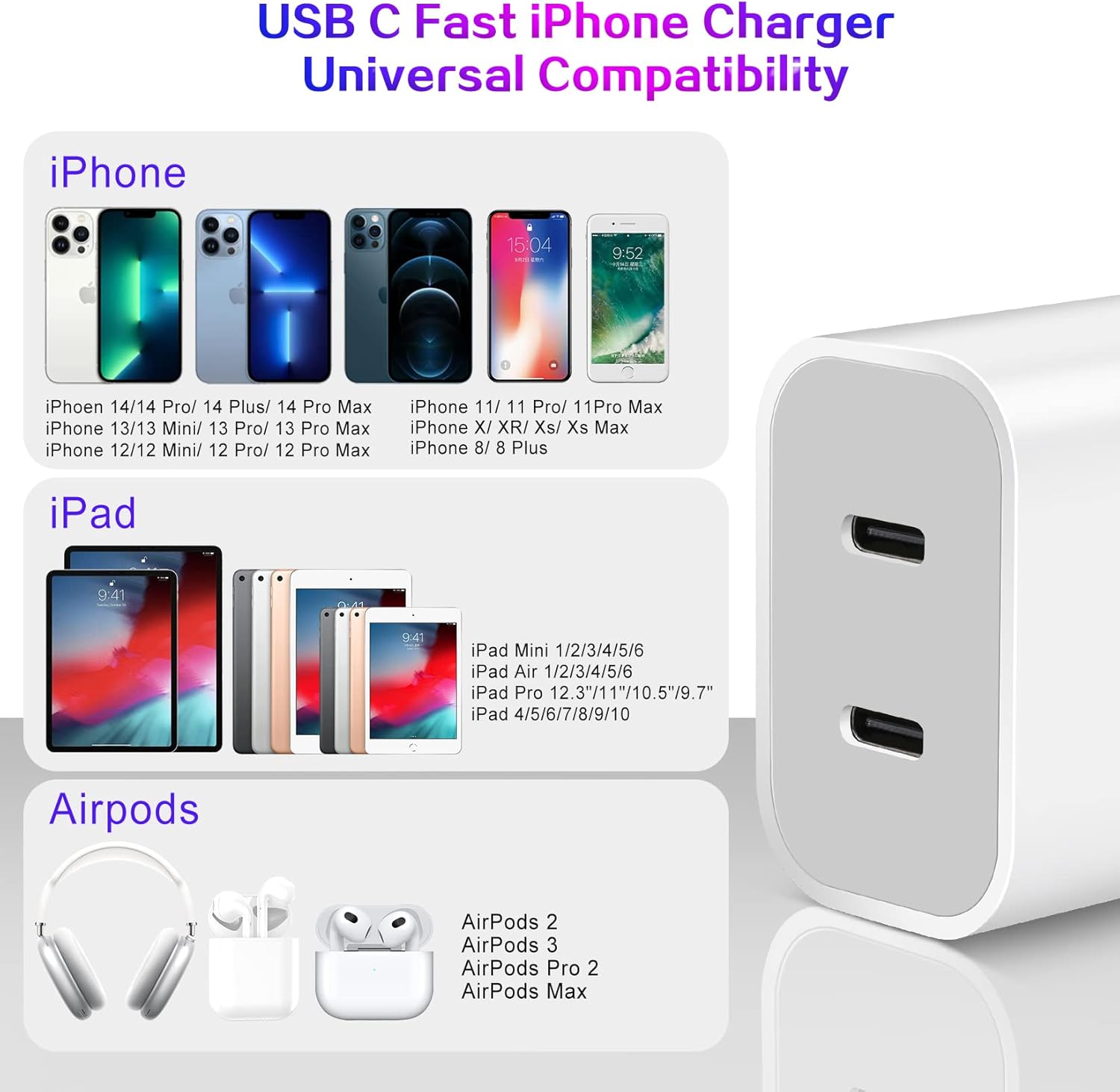 - 【Dual Port USB C Apple iPhone Fast Charger】Dual Port USB C iPhone Charger Fast Charging Block With the latest PD Fast Charging technology,Dual Port USB-C iPhone 14 13 Fast Charger With 6FT USB C to Lightning Cable Cord Charge your device up to 3X Faster than Original 5W Charger.The Dual Port USB C iPhone Wall Charger Adapter has Built-in protection to protect your device from overcurrent,and over Charging.