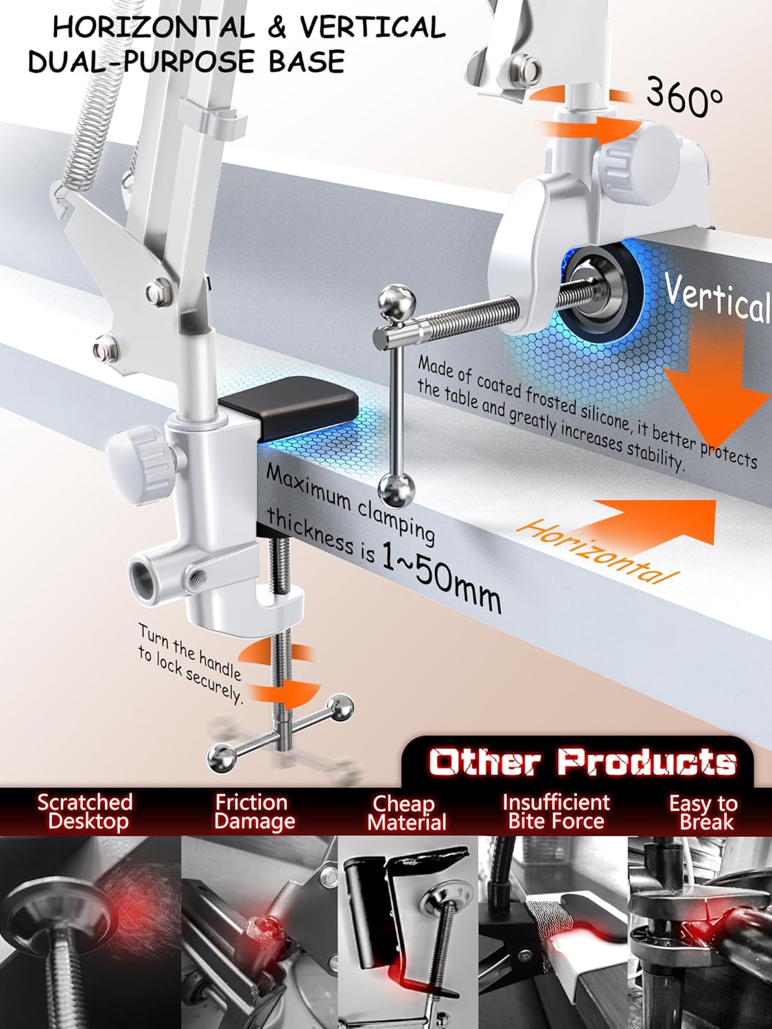 - Base for vertical and horizontal use:The base is equipped with two jacks, which can realize the vertical and horizontal use of the stand, and it is equipped with a silicone mat, which will not damage your headboard, and has high stability during use. The base can firmly clamp the table, bedside and other installation surfaces by about 40mm. Installation requires no tools or holes.