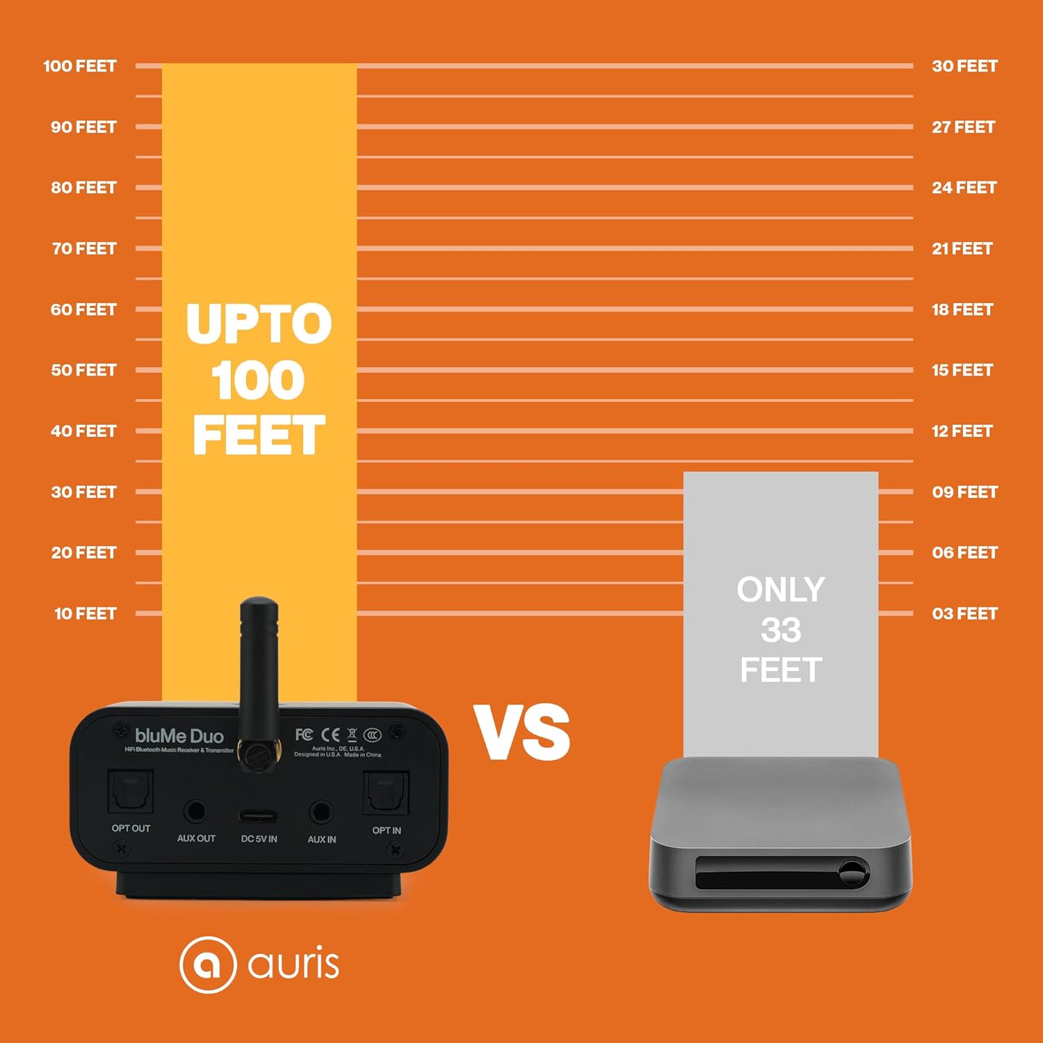 - VERSATILE CONNECTIVITY & EXTENDED WIRELESS RANGE: Stream audio to two Bluetooth headphones or speakers at the same time. Featuring Analog RCA and Digital Optical inputs as well as outputs, bluMe Duo is designed for ultimate compatibility with audio systems and TVs of all types, for true high resolution audio. Utilizes special circuitry and external gain antenna to extend the wireless range to up to 30 meters / 100+ feet, providing glitch-free performance that works through multiple walls.