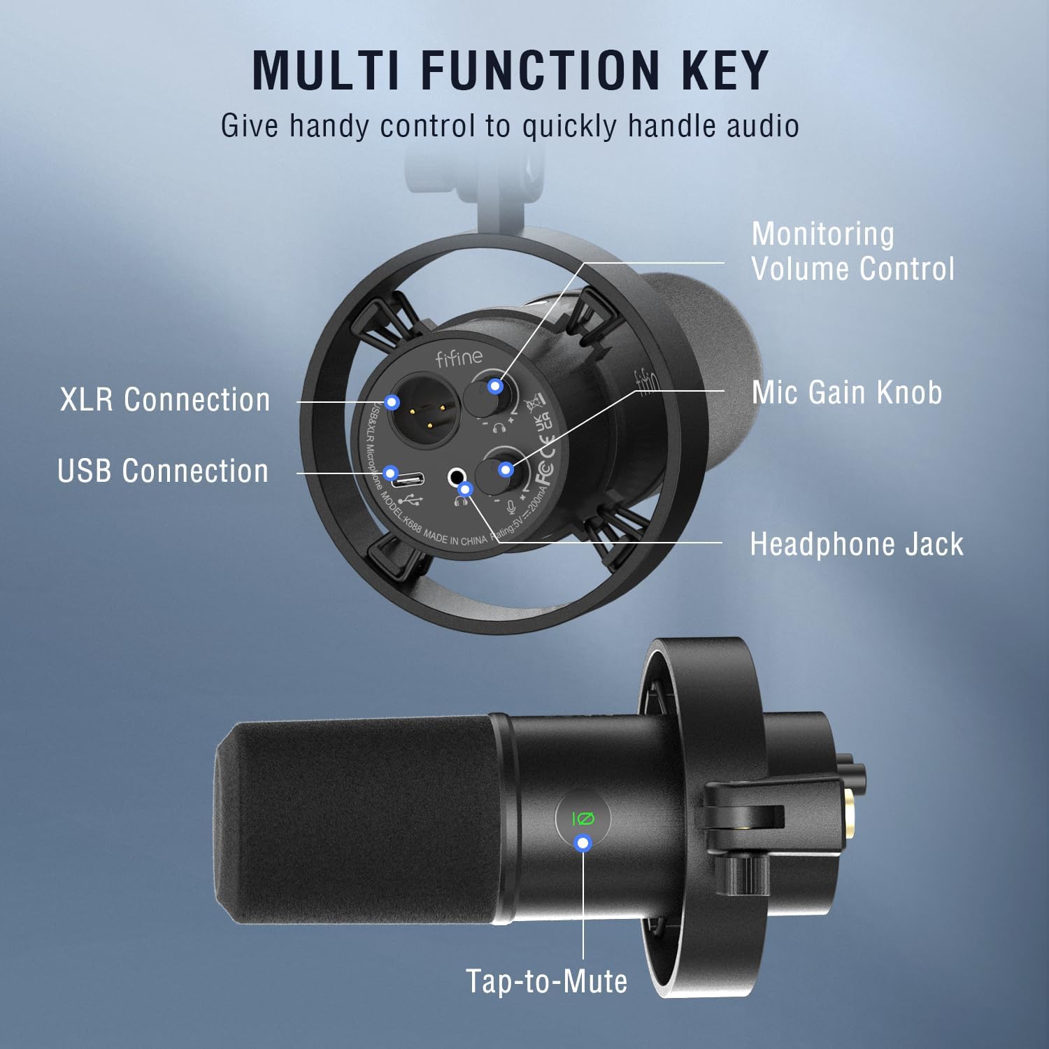 - [XLR and USB Connectivity] Provided with both USB and XLR connections, the podcast dynamic microphone kit for PC is a significant benefit for you to access podcast recording in different ways. You can choose a plug and play USB connection to quickly go into recording work. You can also upgrade your audio equipment by using the XLR connection with audio interface/mixer to enhance sound quality.