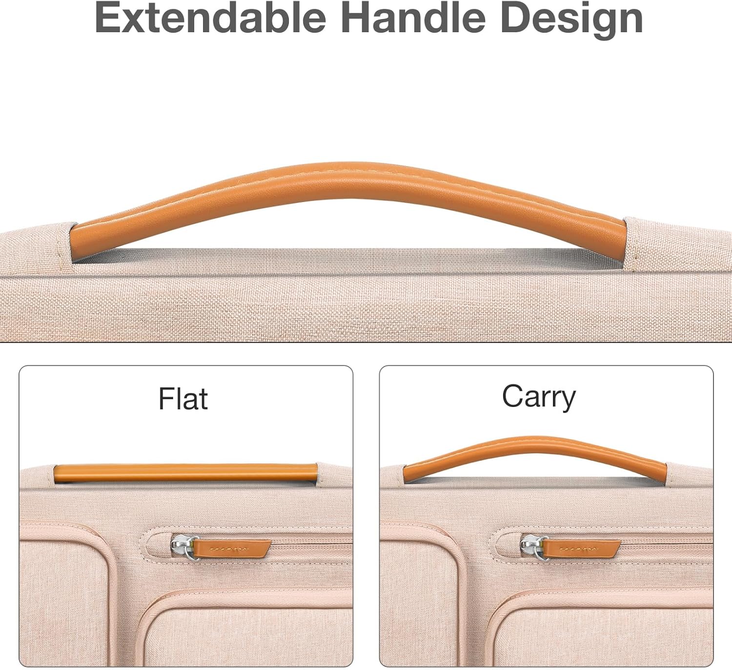 - 360 degree all around protective reinforced interior edge briefcase carrying case bag protect your laptop from any accidental dropping. Extendable handle design makes it to carry your laptop around in comfort, you can also tuck away the handle. Side opening zipper design, avoid accidental dropping of your laptop while carrying. 4 front zipper pockets provide enough space to keep mouse, earphone, pens and notepads, offering added convenience.