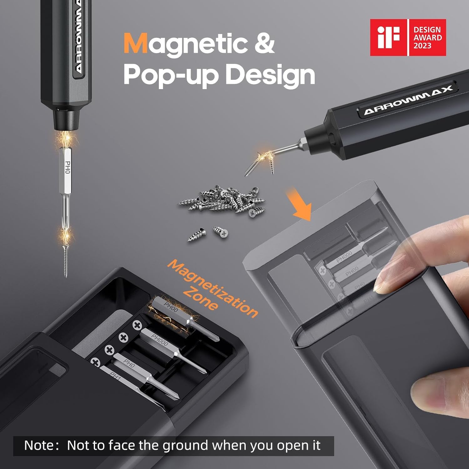 AM ARROWMAX Electric Screwdriver, Precision Screwdriver w/ 34 Magnetic Bits, 4 Torque Settings, Red Dot, IF Winning Design, Rechargeable Mini Repair Tool Kit for Phone, Laptop, Camera (SES) Black