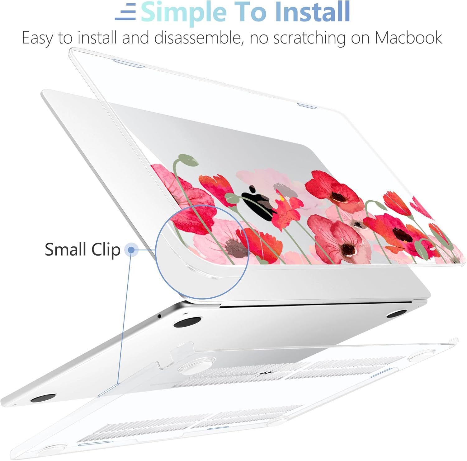 - Design Features of Case: The bottom case is designed with vents for maximum heat dissipation. The bottom case has non-slip feet to avoid slipping during use. The precise cutting design allows you to access all the ports of your MacBook. It is easy to install and remove