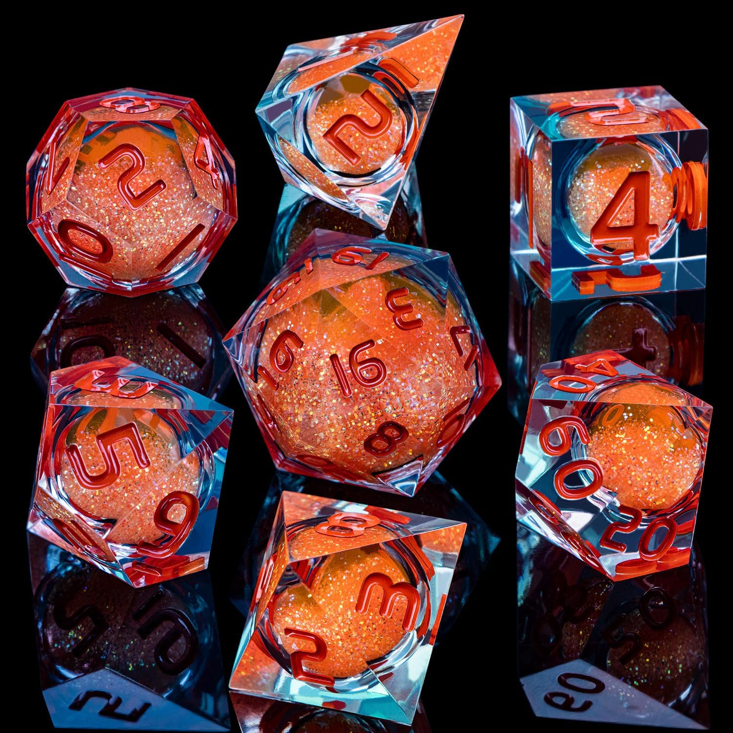 ARUOHHA Liquid Core DND Dice Set, 7pcs Resin Sharp Edged Dragons Dice Role Playing Games, RPG Orange Dungeons Polyhedral Dice with Gift Box D20 D12 D10 D8 D6 D4
