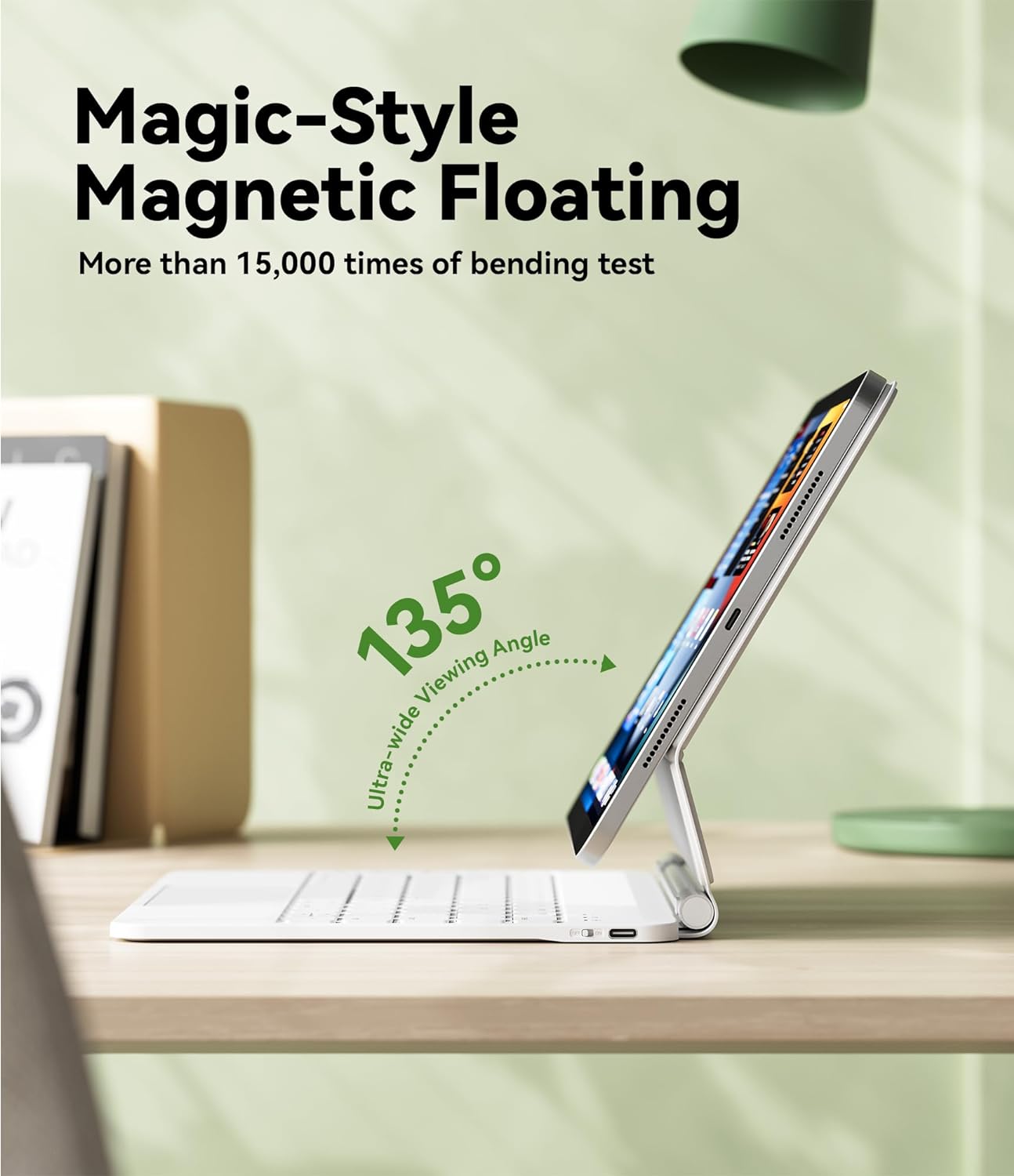- Quick-Set Magnetic Stand: Featuring a strong magnetic matrix of 31 magnets that provide up to 2600GS of holding power, the Quick-Set Magnetic Stand seamlessly integrates with your iPad A16 11th gen, allowing you to easily open the floating cantilever stand and adjust it to the perfect angle for typing or browsing.