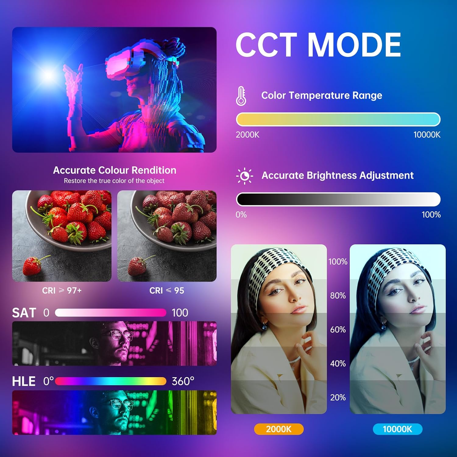 - 【16 LIGHTING EFFECTS AND CUSTOMIZED EFFECTS】: Lighting can be adjusted to suit your needs, High Color Rendering Index CRI 97+ and TLCI 97+ increase the CCT adjustment accuracy from 100 to 50, allowing you to make more precise adjustments. Photography Lighting Kit has 16 light effects and 16 different styles of light source types to choose from, which saves a lot of adjustment time when you need a specific light source.