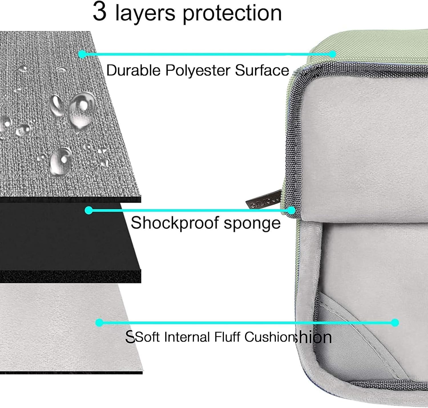 - The 360 degree protective shockproof laptop sleeve with handle carrying bag internal dimension: 13.39 x 9.25 x 0.79 inches (L x W x H); external dimension: 13.98 x 9.84 x 0.79 inches (L x W x H). The front side pocket dimension: 11.61 x 9.25 inches (L x W). Made of polyester material, protect your laptop against accidental spills. Slim and lightweight, does not bulk your device up and can easily slide into your briefcase, backpack or other bag. Ideal for business, daily and travel.
