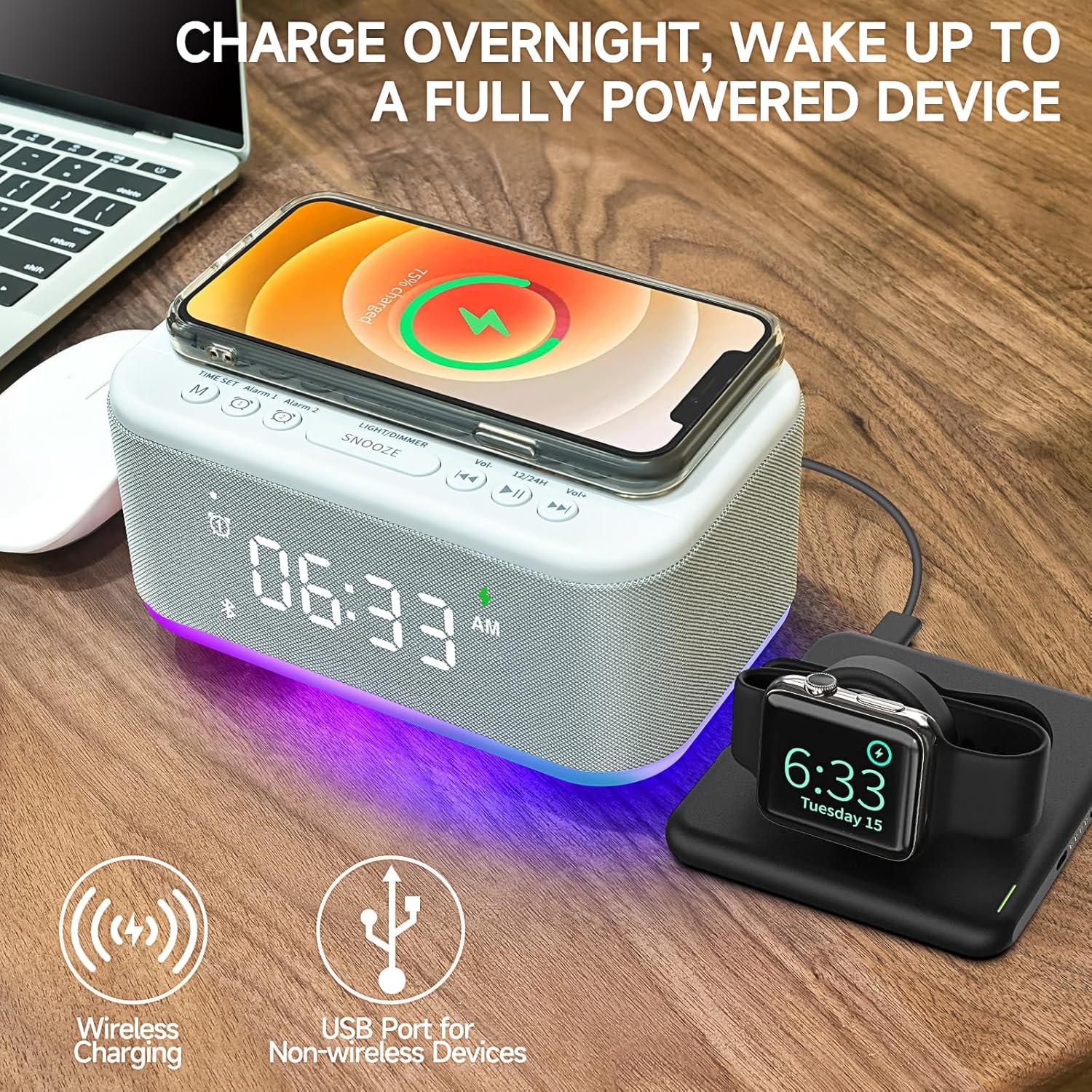 Alarm Clock Speaker Wireless Charger, Digital Alarm Clocks Bedrooms Bluetooth, Alarm Clock Dimmable Light Bedrooms Dual Alarm Snooze Dimmer 12 24H RGB Night Light Bluetooth USB AUX, Gray