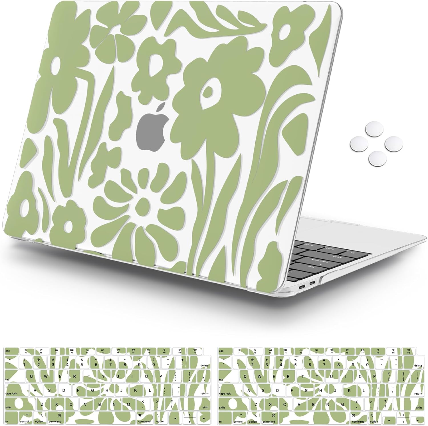 iCasso Compatible with MacBook Air 13 inch Case 2020-2018 Release M1 A2337 A2179 A1932, Green Flower Protective Hard Shell Case +Keyboard Cover + Screen Protector(Flower)