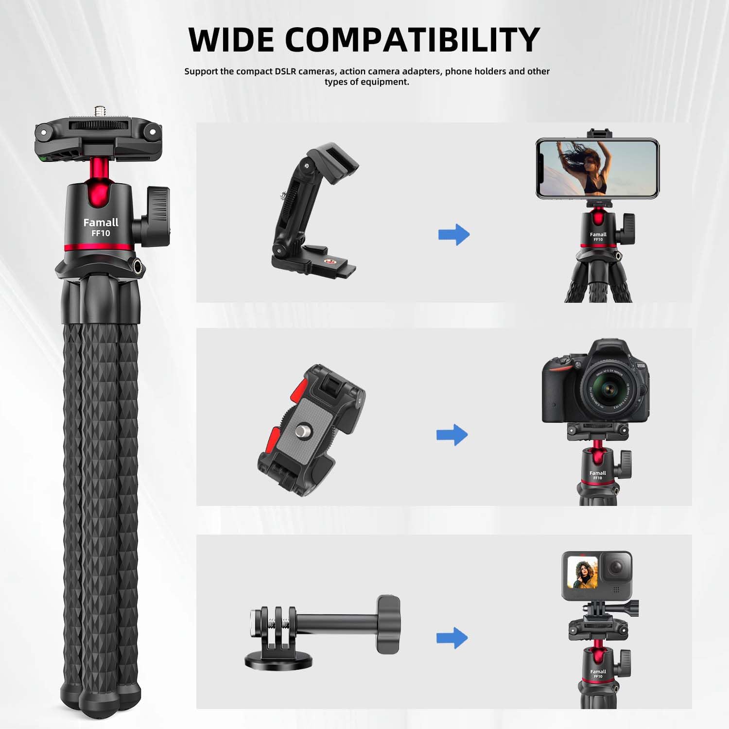 Famall Flexible Phone Tripod for GoPro, Mini Camera Stand with Remote, 1/4'' Screw with Phone Holder&Cold Shoe, Tripod Holder for iPhone Samsung Canon Nikon Sony Streaming Vlog Smartphone
