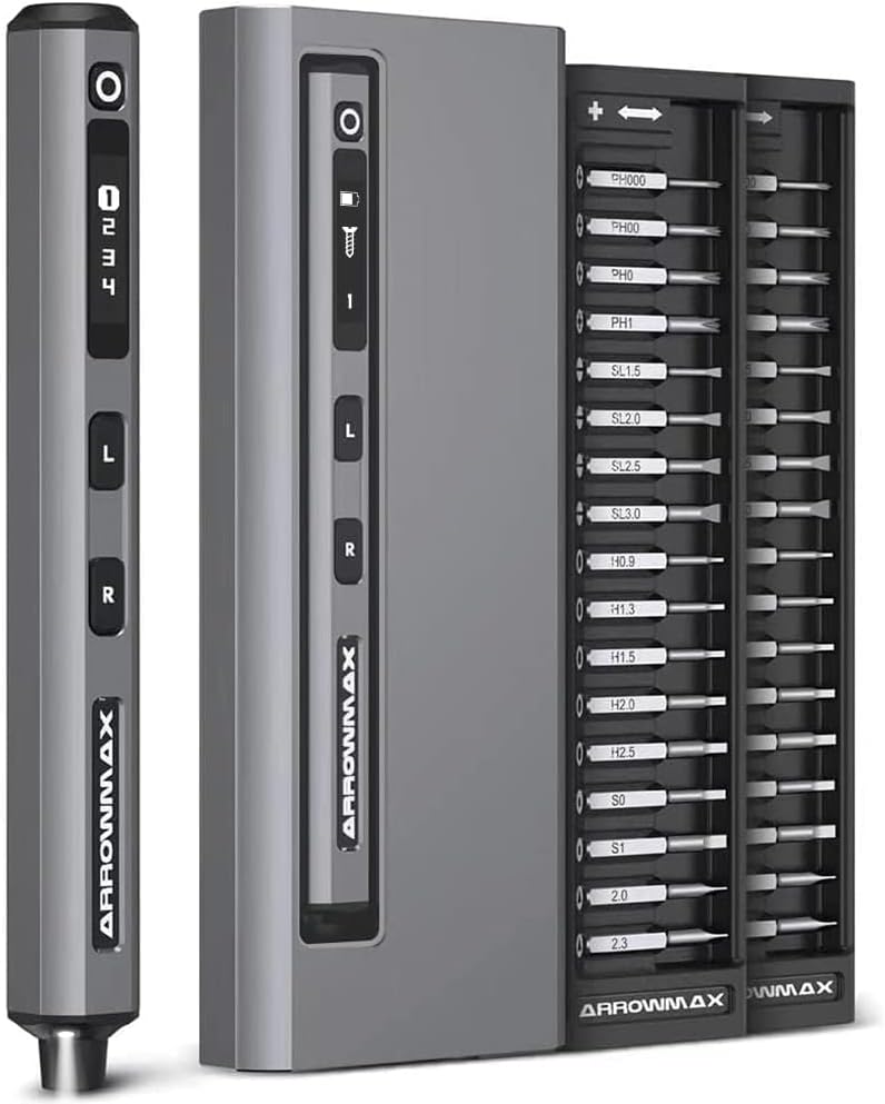 AM ARROWMAX Mini Electric Screwdriver, 4 Torque Settings Precision Screwdriver w/ 34 Magnetic Bits, Magnetic Storage, 5/32''Hex, Repair Tool Set for Phone Camera Laptop Watch (SES) Gray