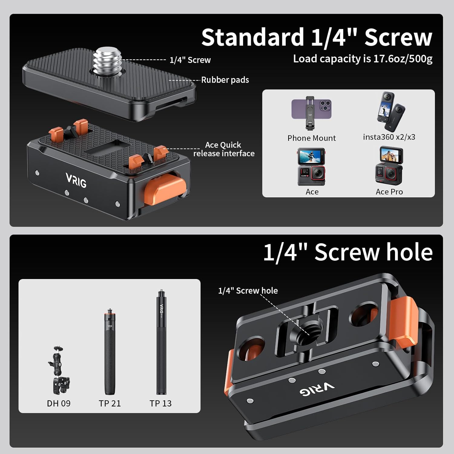 - [Super Quick Release and Setup Design] Quick Release Plate originally created by VRIG allows you to release and set up between camera/smartphone/tripod/monopod/stabilizer/slider quickly instead of screwing. The QR Plate allows you to switch between upright mode and underslung mode in a second