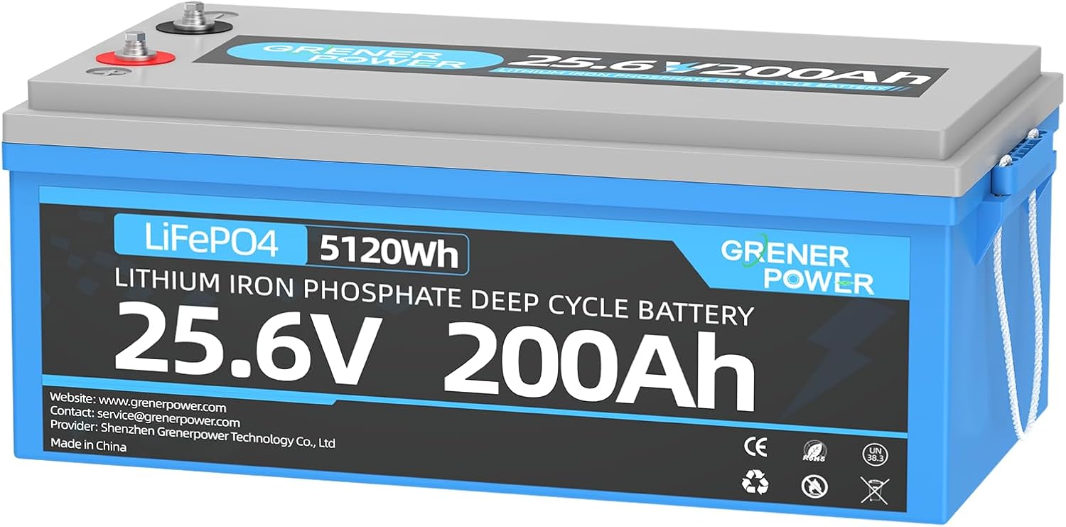 - 🔋[5120Wh-Enormous Capacity] GrenerPower 25.6V 200Ah LiFePO4 Battery has a 5.12kWh sufficient energy, which is double usable energy compared with a basic 100Ah battery. You can enjoy 2-day off-grid outdoor activities, based on the daily consumption of an average of 2.5kWh, which allows you to enjoy more leisure time alongside an RV trip.