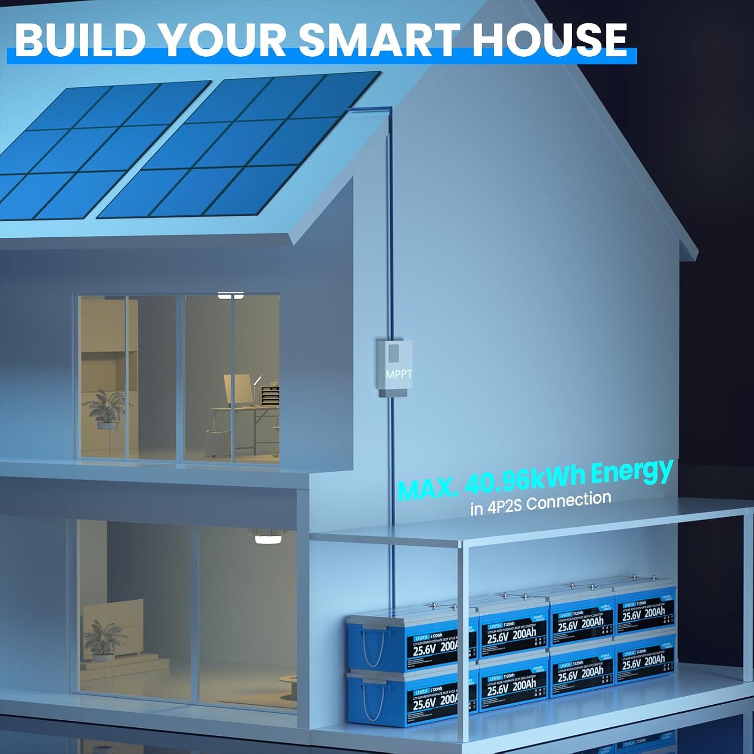 - ⚡[DIY Your Smart House with Max. 40.96kWh] GrenerPower 25.6V 200Ah Lithium-ion Battery supports up to 4 in parallel and 2 in series (Max 4P2S) to get a 51.2V 800Ah battery bank system. Our lithium battery requires almost no maintenance, making it able to service as an energy storage unit for more than 10 years. In the long term, it will help you save a lot of electricity bills.