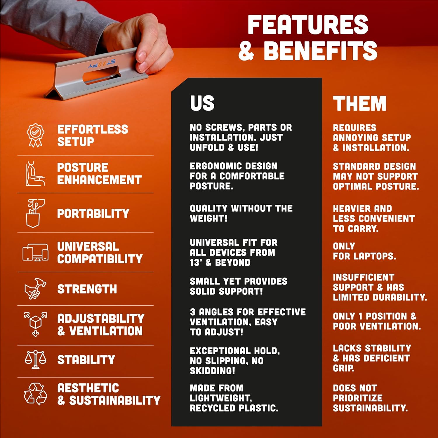 - SETUP'S A BREEZE - Just unfold and go—no screws, no hassle. Instant use, instant time saver! Steepy desk laptop stand is a travel laptop stand made out of strong and durable recycled plastic, with rubber edges to provide the sturdy and stable support your device needs and prevent it from sliding or skidding