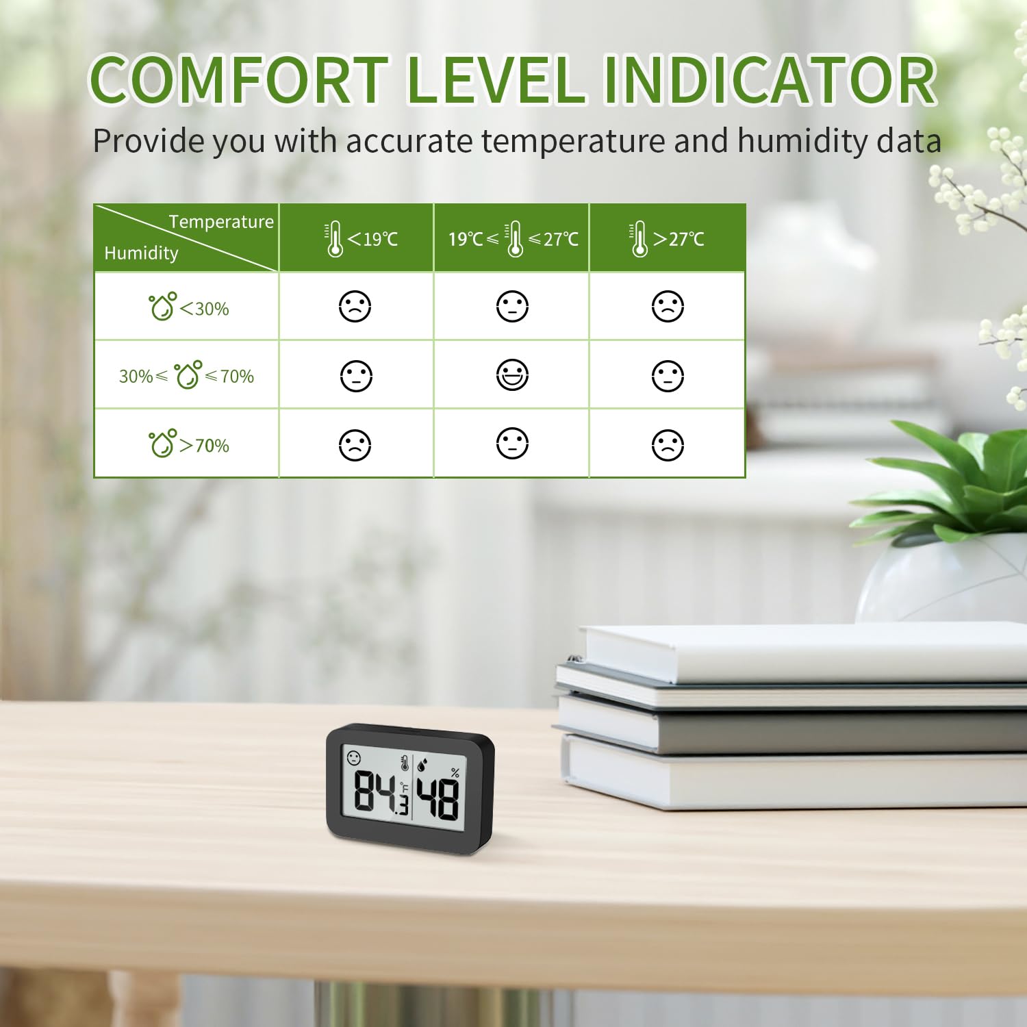 - 【Comfort Indicator with Face Icon】The Smilely face and Sad Face can accurately reflect the comfort of humidity and temperature in the home. Help to adjust the humidifier, dehumidifier settings and humidistats, great for monitoring family's living conditions and health by preventing colds, dry skin