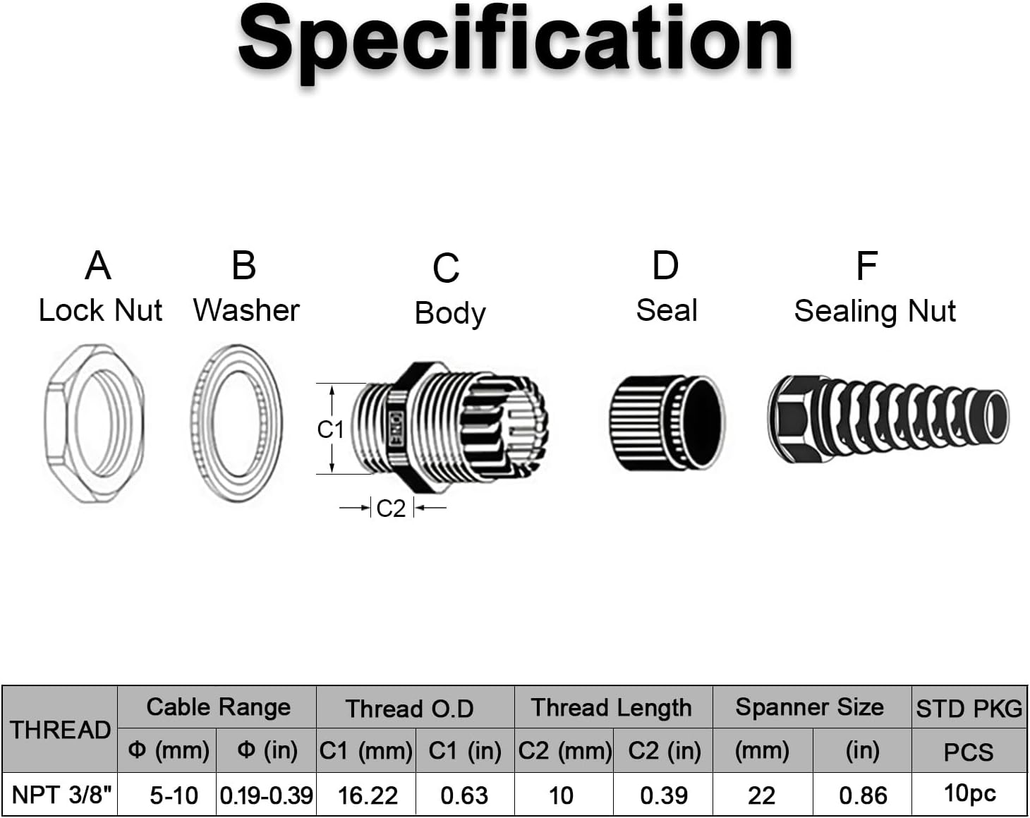 - Cable Range: Fits cable range 0.19in-0.39in(5-10mm); easily pass the cable through the gland then tighten the cap.* Data in detail please check chart in the pic.