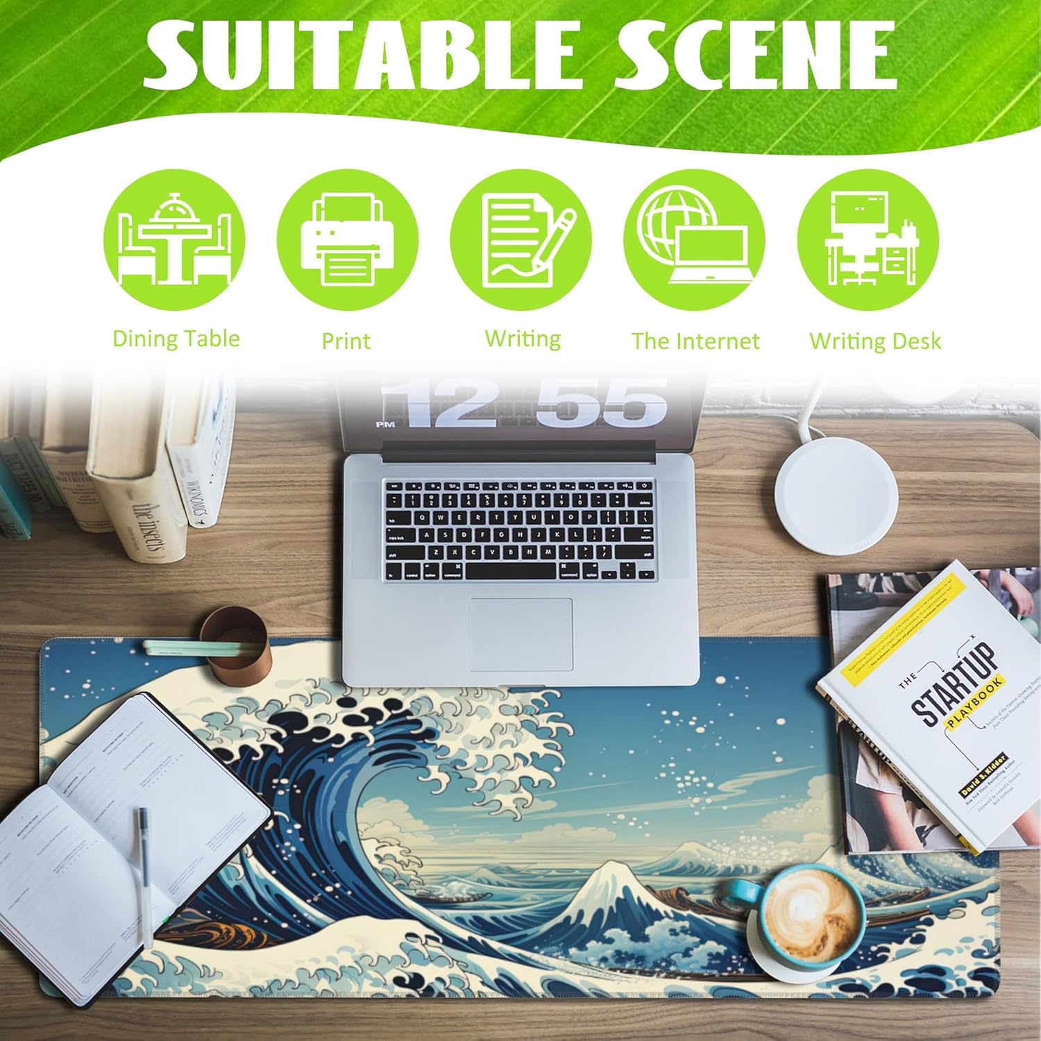 Desk Mat,Blue Japanese Sea Wave Desk Pad,Japanese Sea Wave Large Gaming Mouse Pad for Desk,Extended Big Computer Keyboard Mouse Pad with Non-Slip Base and Stitched Edge,31.5"x11.8"