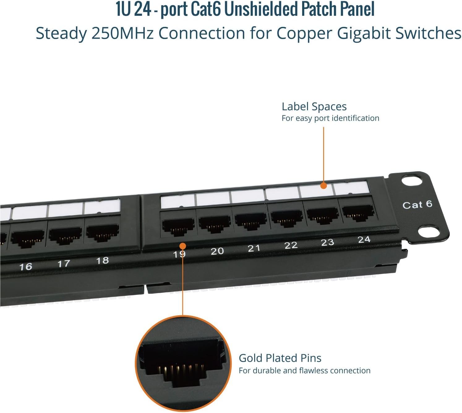 - High-Performance Compatibility: The 24-port patch panel is designed to support Cat6 cabling, while remaining fully compatible with Cat5e and Cat5, ensuring flexibility for various network setups