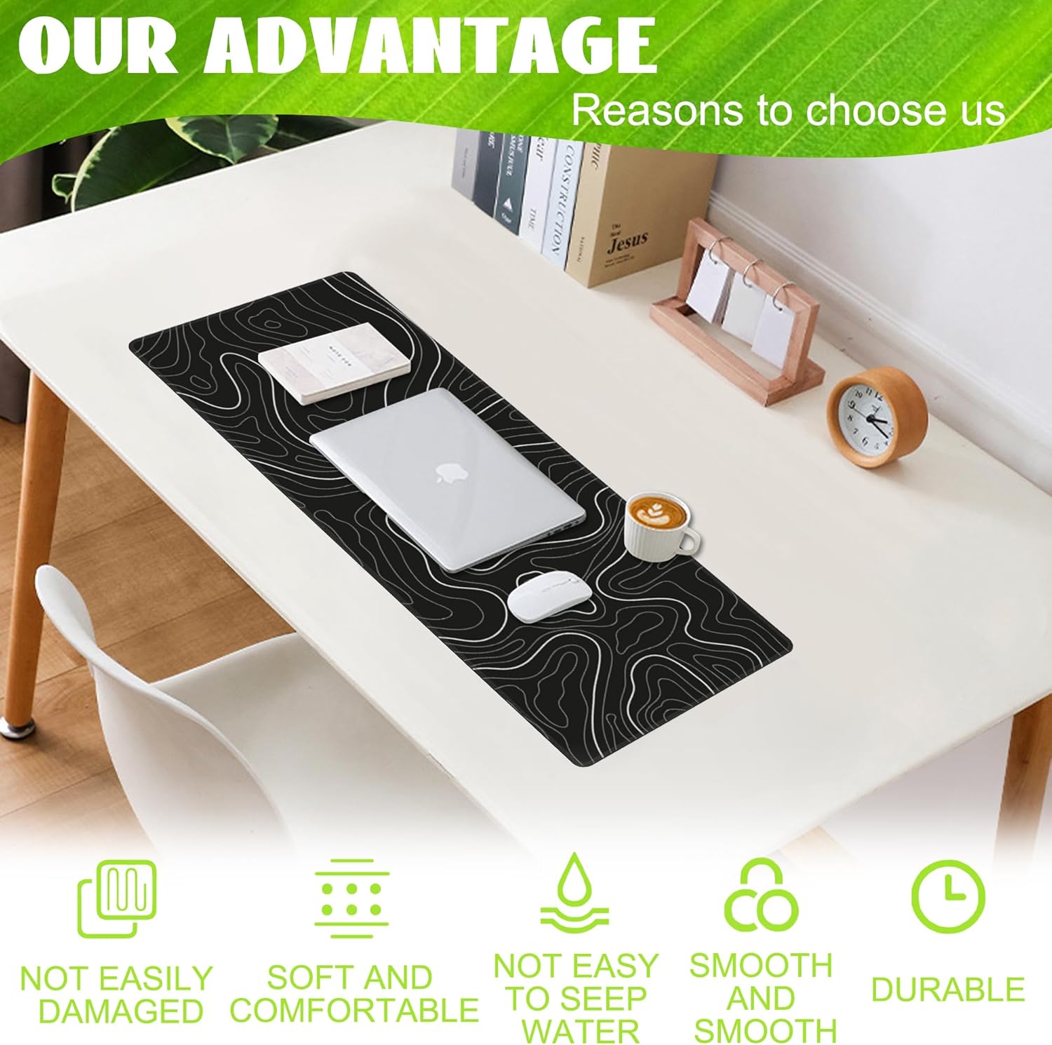 Desk Mat,Black Topographic Contour Map Desk Pad,Topographic Contour Large Gaming Mouse Pad for Desk,Extended Big Computer Keyboard Mouse Pad with Non-Slip Base and Stitched Edge,31.5"x11.8"