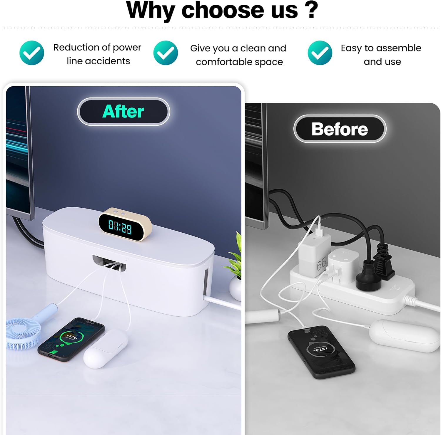 - [Efficient Cord Management Solutions] The cable organizer box with exciting new design which can hide and organizes your cables easily to keep your cables organized and suitable for most wires and cables in your home and office