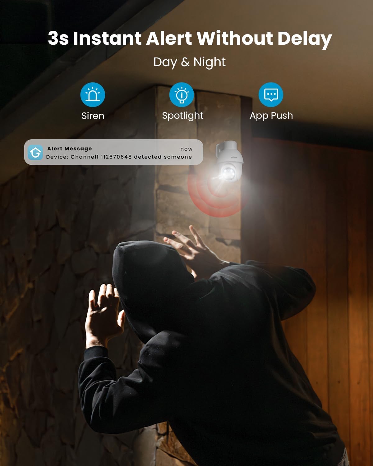 - 𝐀𝐈 𝐃𝐞𝐭𝐞𝐜𝐭𝐢𝐨𝐧 & 𝐀𝐮𝐭𝐨𝐦𝐚𝐭𝐢𝐜 𝐇𝐮𝐦𝐚𝐧 𝐓𝐫𝐚𝐜𝐤𝐢𝐧𝐠 Adopting advanced AI technology, our PoE camera system enhances the accuracy of human/vehicle/package/pet recognition, minimizing unnecessary alarms triggered by minor disturbances. Set a motion detection zone freely that enables the outdoor camera to focus on motion on your property. This outdoor PTZ camera automatically tracks moving objects and activates lights at night, sending real-time alerts to your phone via the app. Even when you’re away, you can receive alerts and take preventive actions.
