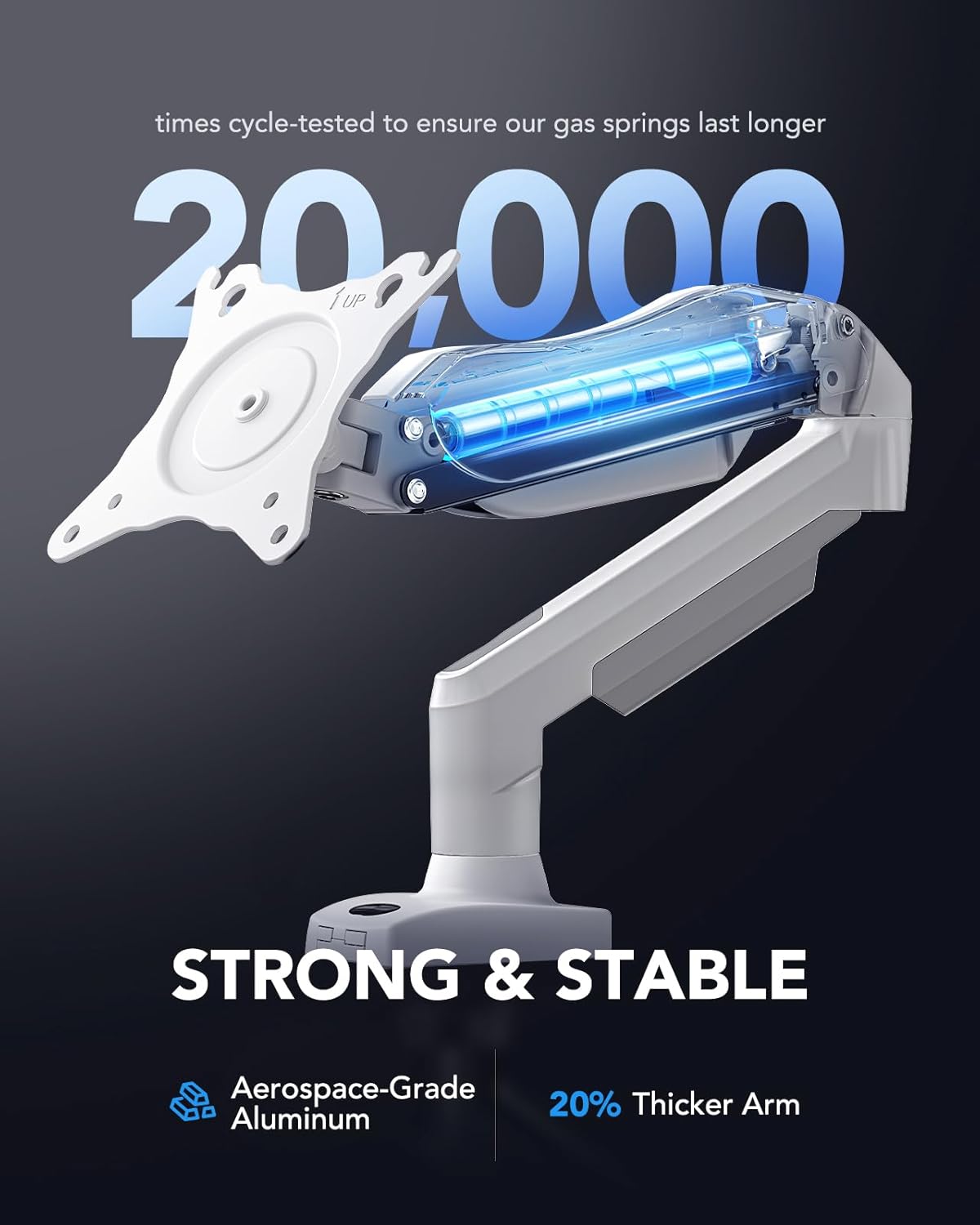 - 80% Sturdier Than Others: At HUANUO, we focus on improving the strength and stability of our single monitor stand. The single desk monitor mount uses automotive-grade gas spring cores and has undergone 20,000 motion tests, which means it can be used continuously for more than 5 years without issue.