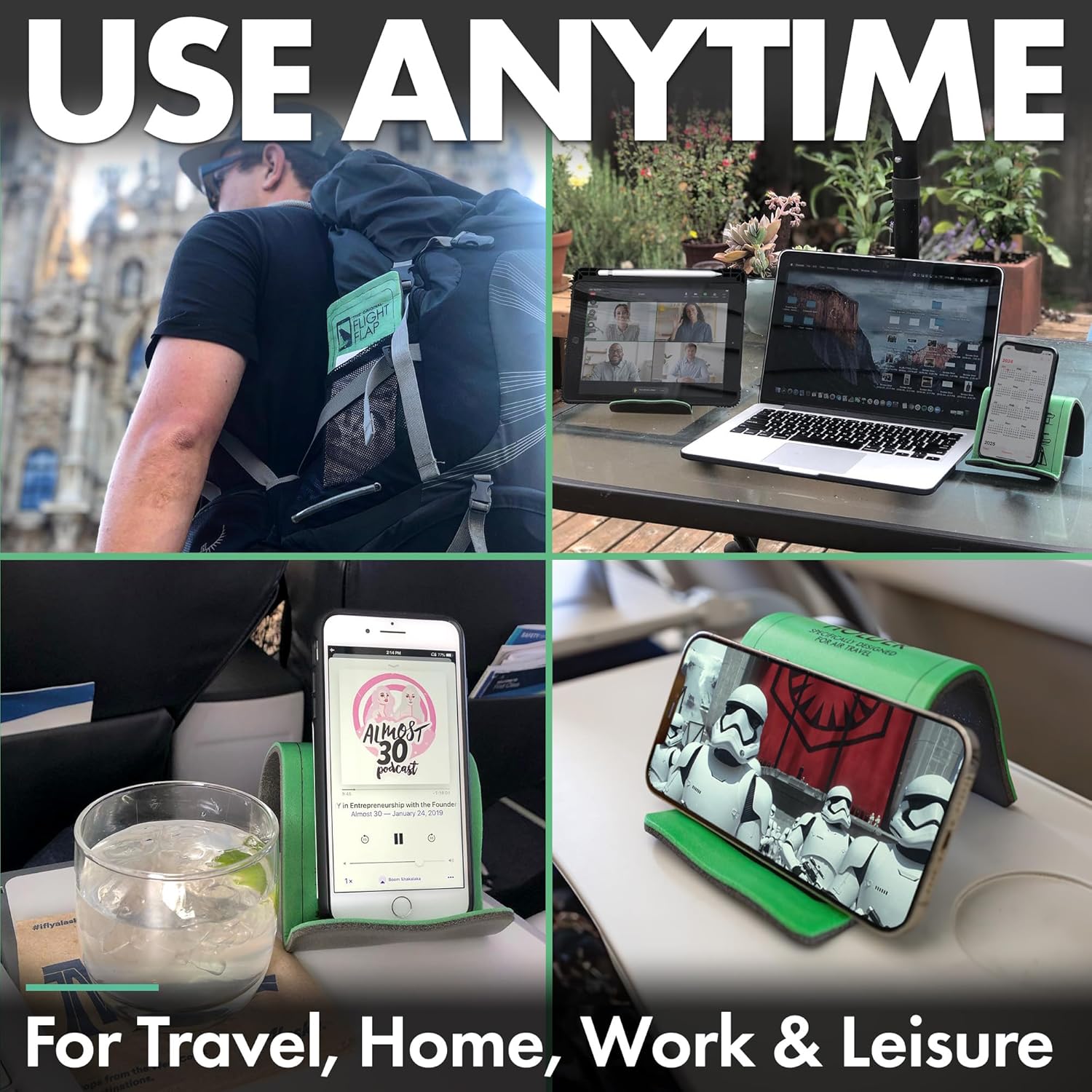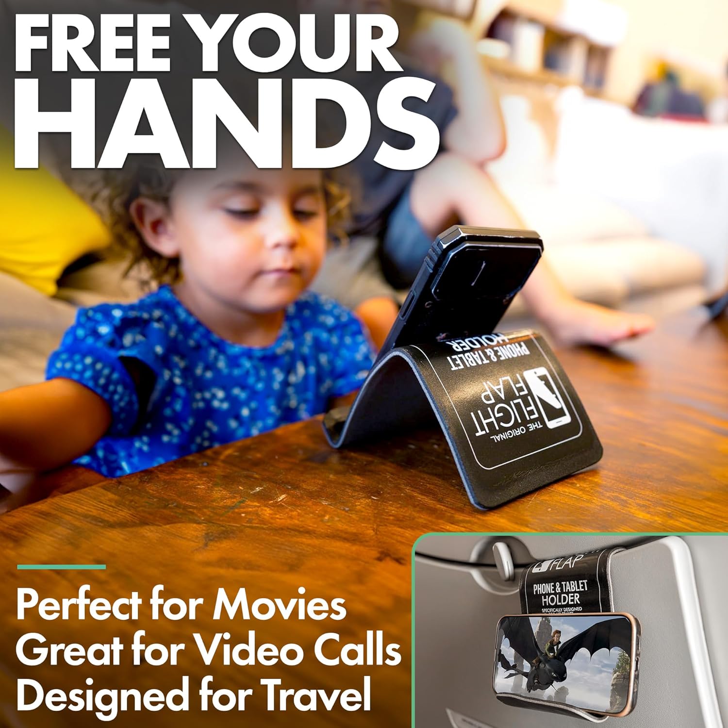- USE FOR TRAVEL, WORK & LEISURE – Great for watching movies, entertaining kids, streaming workouts, hosting a zoom video call, or cooking with recipes on your phone. Use the FLIGHT FLAP phone stand anywhere to grip your device and view your content comfortably. Attaches to most airline seat backs and tray tables. During car rides, attach behind the headrest and stream movies for kids. Properly positions your phone to host zoom meetings.