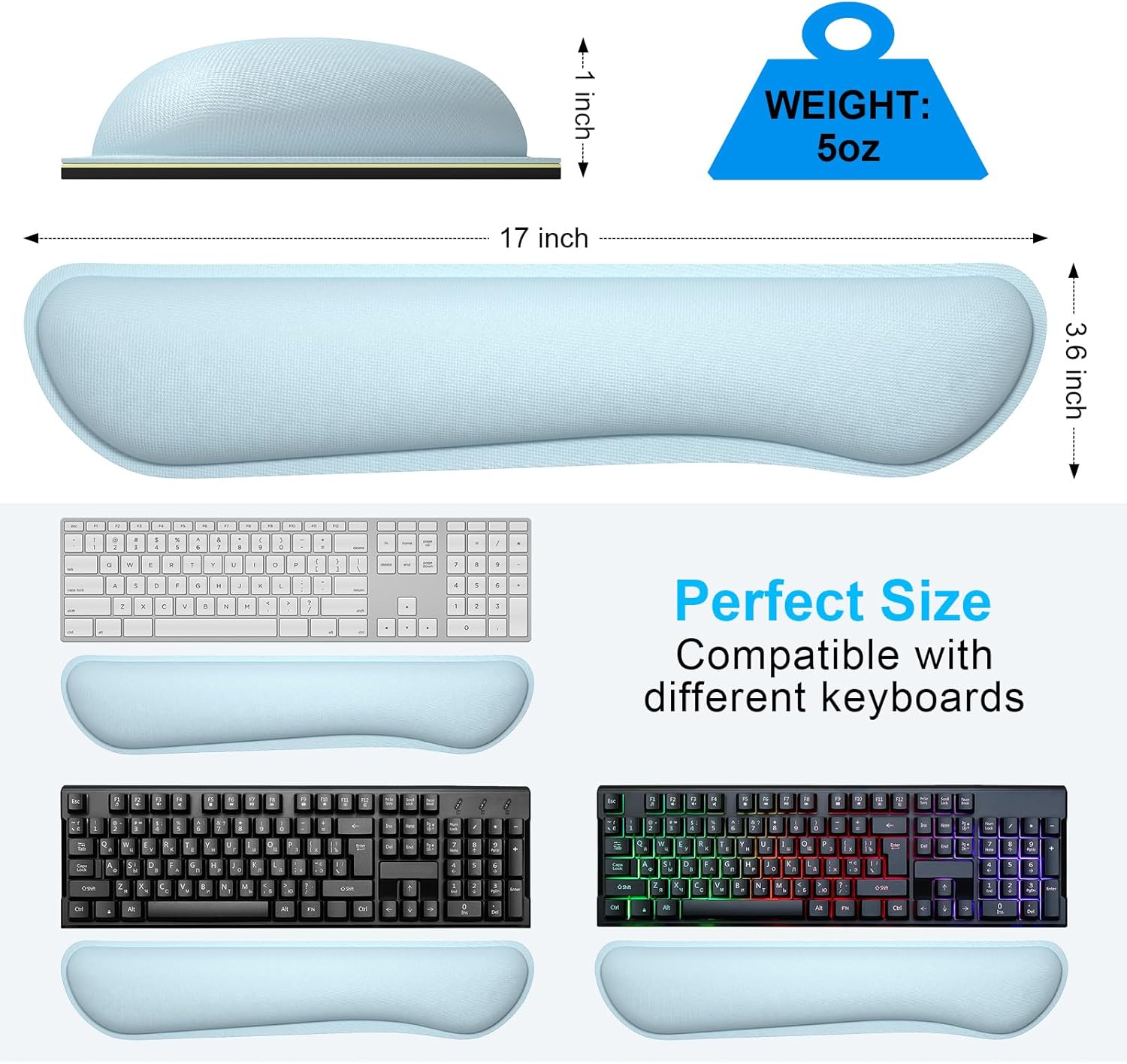- Memory Foam Wrist Support:Memory foam inside the keyboard and mouse wrist rest keeps your wrists lifted and supported in a comfortable way. get full support to distribute pressure and put angled up wrists naturally