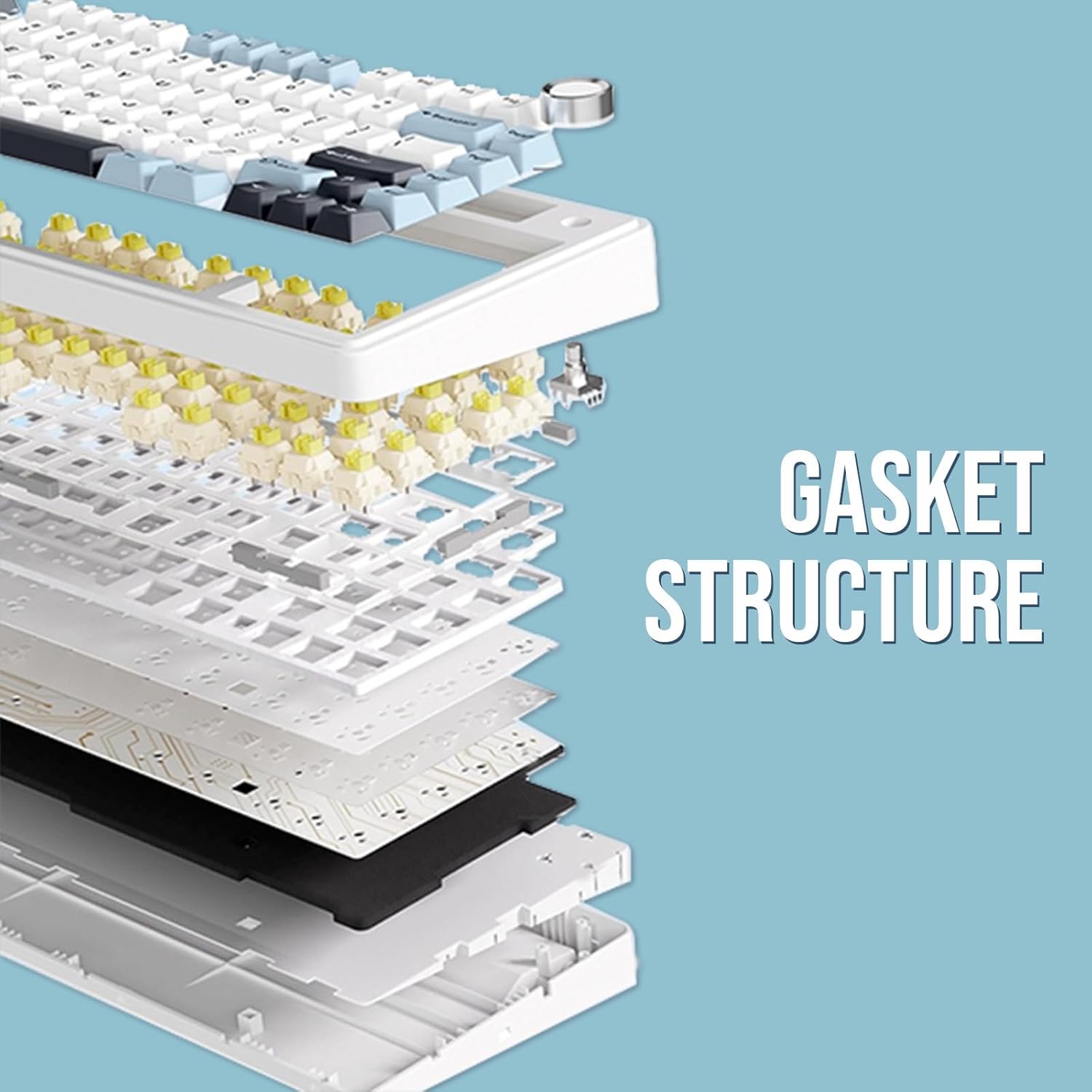 - 【Optimized 75% Compact Layout&Innovative Gasket Structure】The F75 redefines space efficiency with its 75% compact layout. This design integrates all the essential keys in a smaller footprint, making it perfect for streamlined desks and mobile setups without sacrificing functionality. Experience the pinnacle of comfort with the gasket structure. This advanced design ensures a flexible yet firm typing experience, reducing fatigue during prolonged use while maintaining a consistent and responsive key feel.