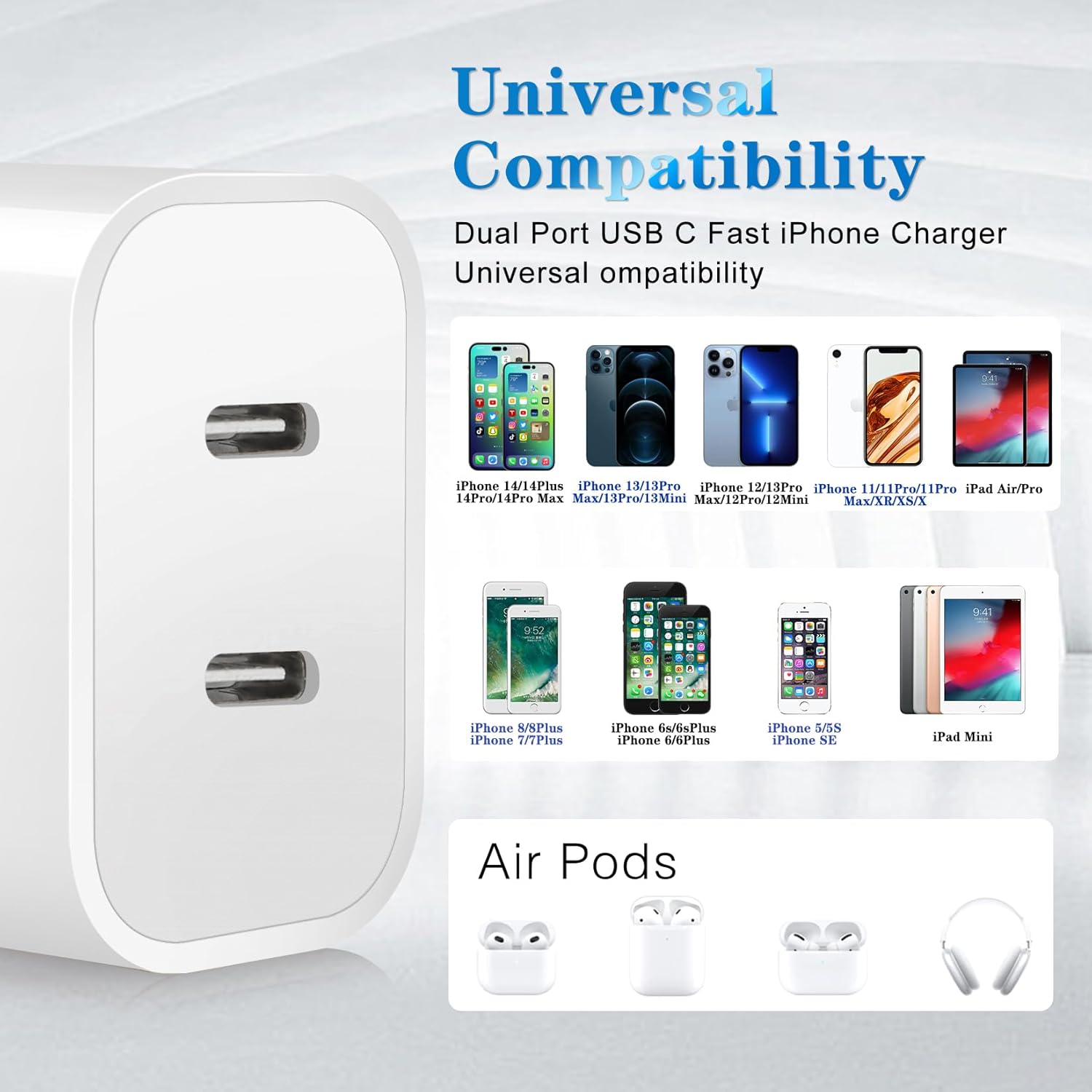 - 【Dual Port USB C iPhone Charger Wide Compatibility】This Dual USB C Charger Block compatible With iPhone 14/iPhone 14 Plus/iPhone 14 Pro/iPhone 14 ProMax/iPhone 13/iPhone 13 MiNi/iPhone 13 Pro/iPhone 13 ProMax/iPhone 12/iPhone 12 MiNi/iPhone 12 Pro/iPhone 12 ProMax/iPhone 11 ProMax/iPhone 11 Pro/iPhone 11/iPhone XS/iPhone XSMax/iPhone XR/iPhone X/iPhone 8Plus/8/iPhone 7/7Plus/6s/6sPlus/6/6Plus/SE/5s/5/5c,iPad/iPad MiNi,AirPods and More Devices.