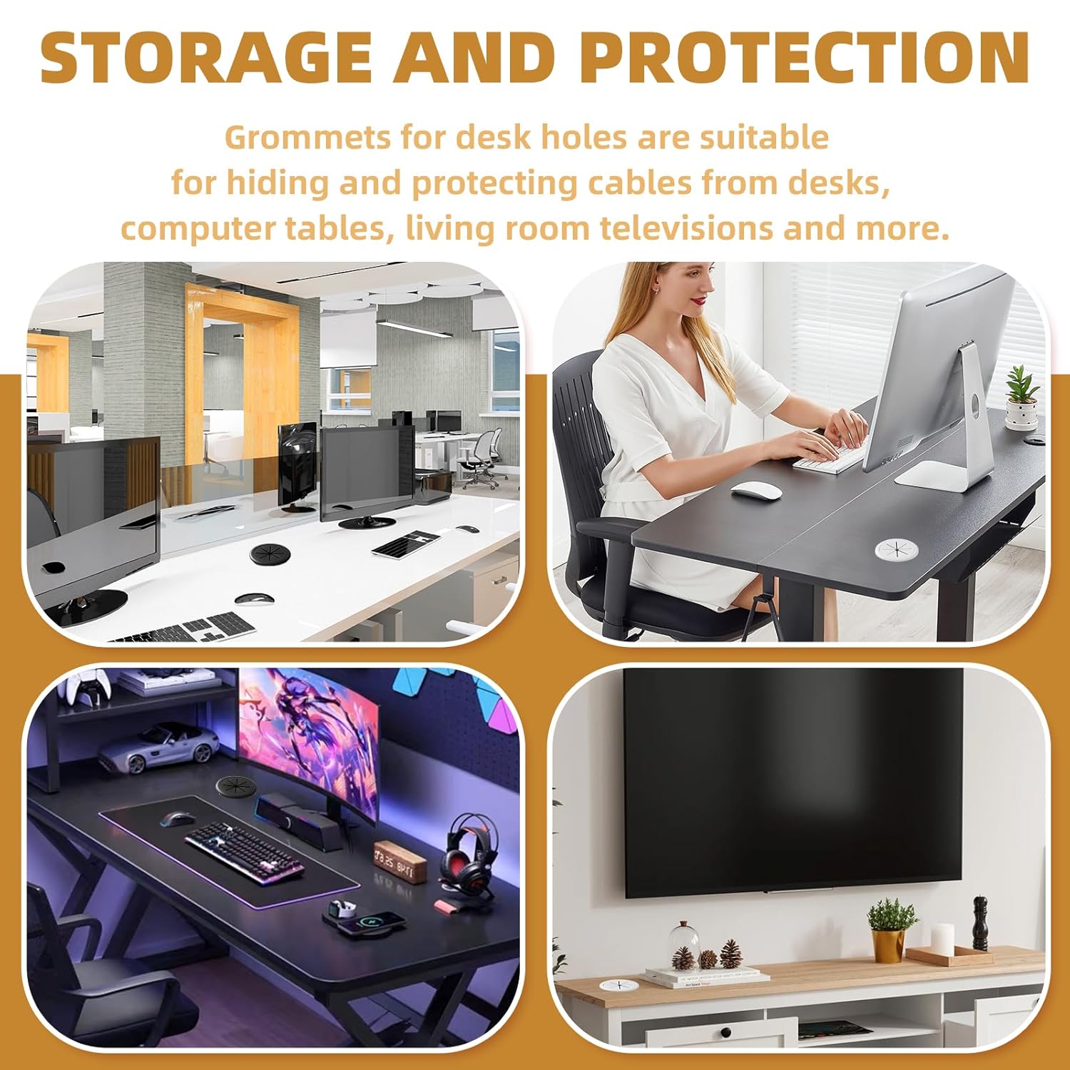 - 【STORAGE AND PROTECTION】 Grommets for desk holes are perfect for managing and hiding cables on desks, computer desks, living room televisions, etc. It also protects the cables from daily wear and tear in other situations and ensures cable safety.