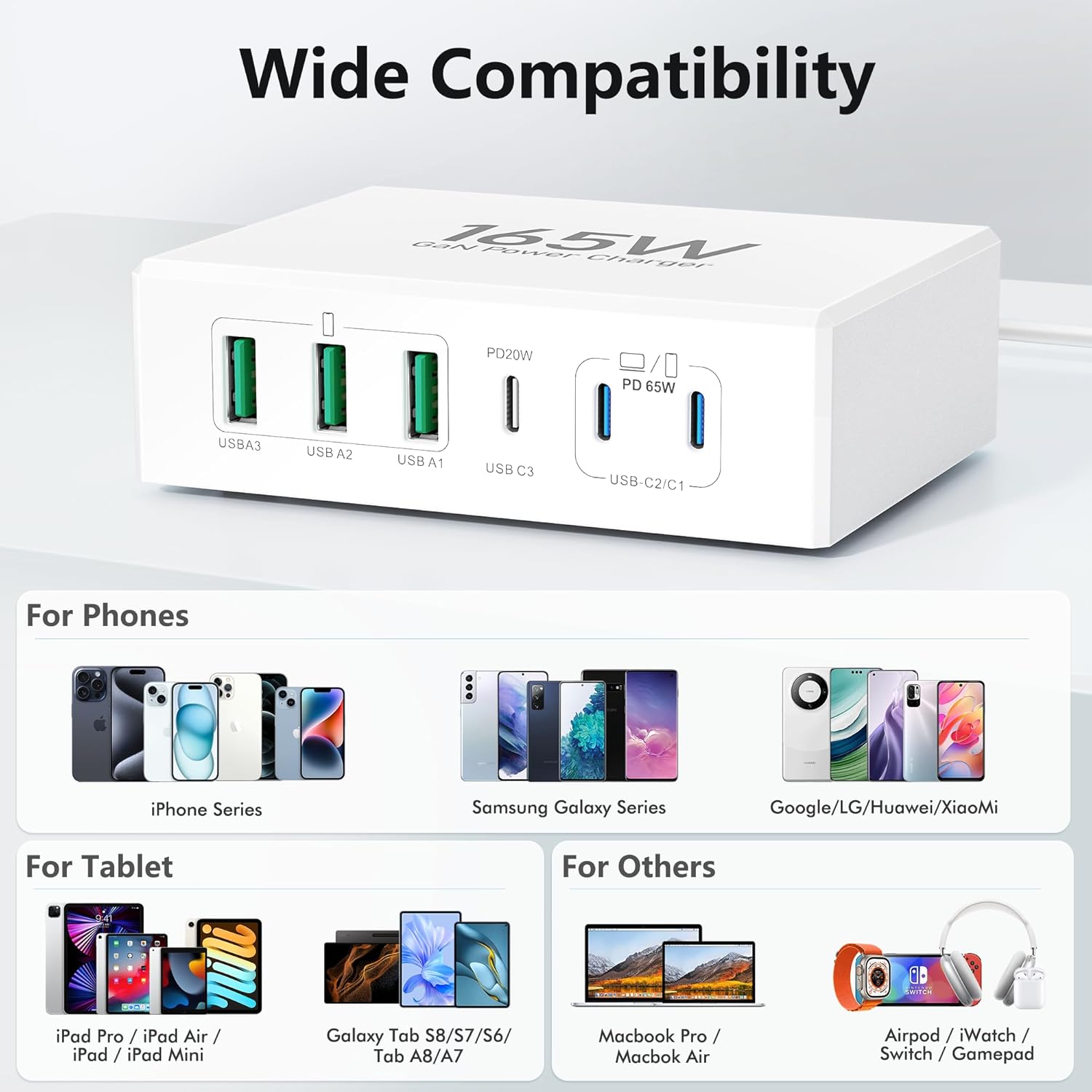 165W USB C Charging Station Hub, 6 Port PD GaN Fast Wall Charger Block Type C Laptop Power Adapter Charger Cube Brick for MacBook Pro/Air,iPad Pro,iPhone16 15 14 13 12, AirPods4,watch10 ultra2