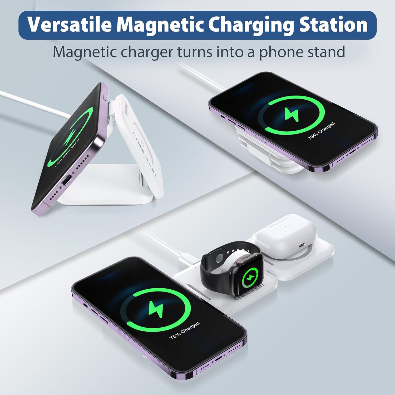 - MULTIPLE DEVICE COMPATIBILITY - This mag safe 3-1 charger is an iPhone magnetic charger. The charger portable for iPhone is compatible with MagSafe-enabled iPhones 15/14/13/12, and Pro/Pro Max, AirPods Pro, 3/2, and all models of the Apple Watch.