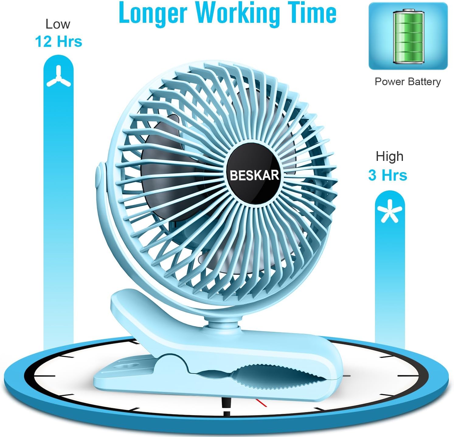 - Large Capacity Battery & Fast Charging: Built-in a powerful battery, the rechargeable clip fan has long working life (3-12 hours depending on different gears). Great Micro Type-C ports for 2A fast recharging, which only takes about 3 hours to be fully charged