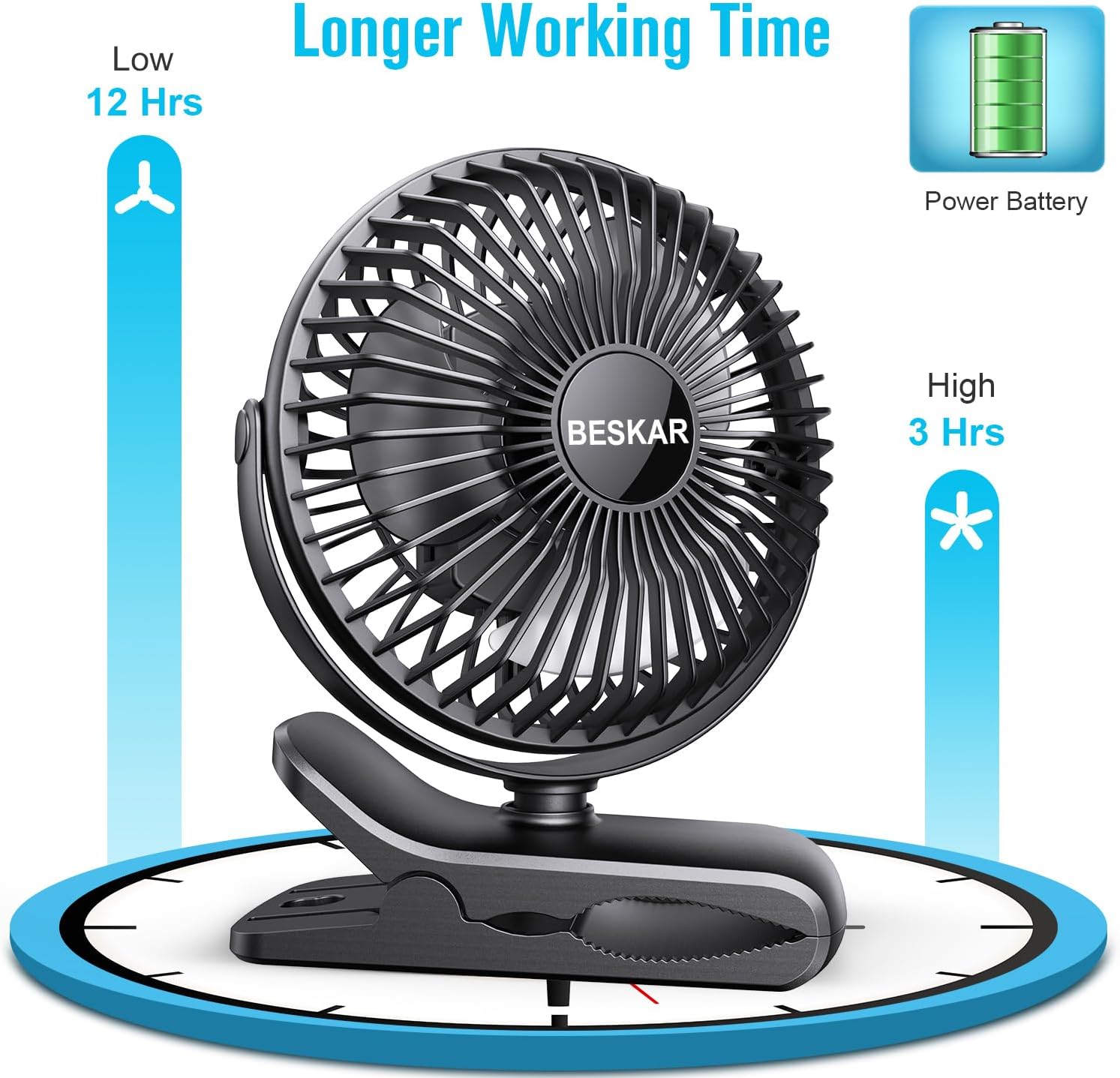 - 【Large Capacity Battery & Fast Charging】—— Built-in 2000 mAh powerful battery, the rechargeable clip fan has long working life (3-12 hours depending on different gears). Great Micro Type-C ports for 2A fast recharging, which only takes about 3 hours to be fully charged.